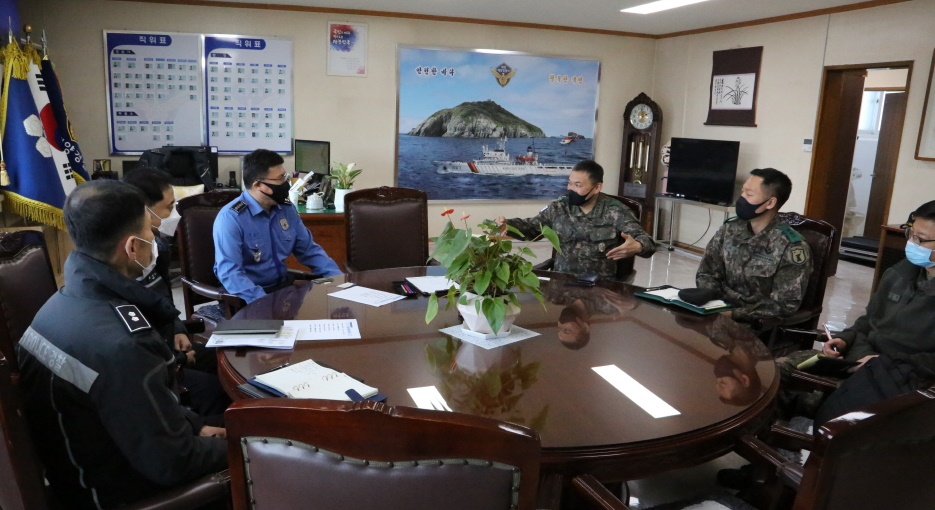 ▲ 윤태연 태안해경서장(가운데 왼쪽)과 32사단 이병석 충절부대장(가운데 오른쪽)이 양측 참모진과 함께 해양안보 강화 등 군·경 통합방위 협력 논의를 하고 있다.