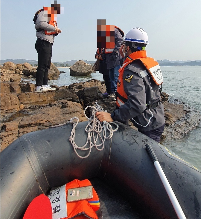 10분여 만에 현장 인근에 도착한 구조정은 낮은 수심으로 갯바위에 접근을 할 수 없어 고무보트를 이용해 갯바위에 들어가 A씨 등 3명을 태우고 14:20분경 육지로 이동시켰다.