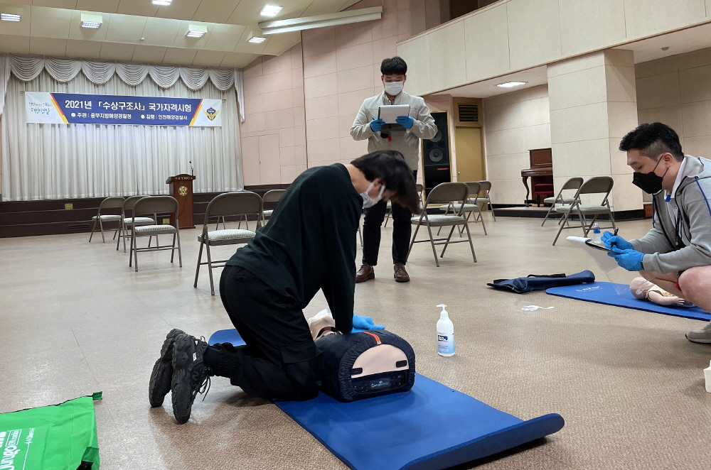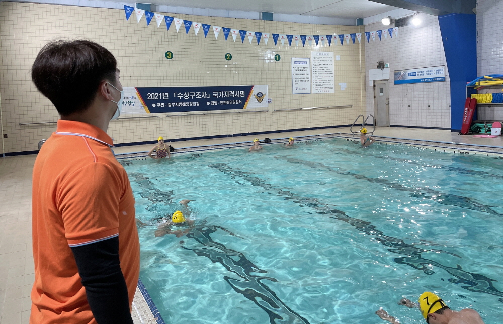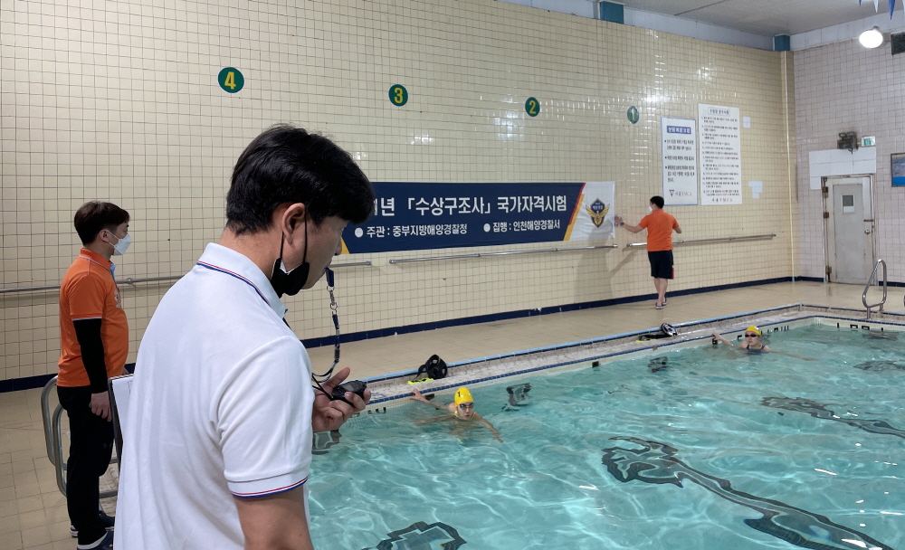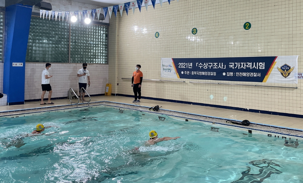 인천해양경찰서(서장 백학선)는 14일 서울 YMCA 수영장에서‘2021년도 제1회 수상 구조사 국가자격시험’을 실시했다고 밝혔다.