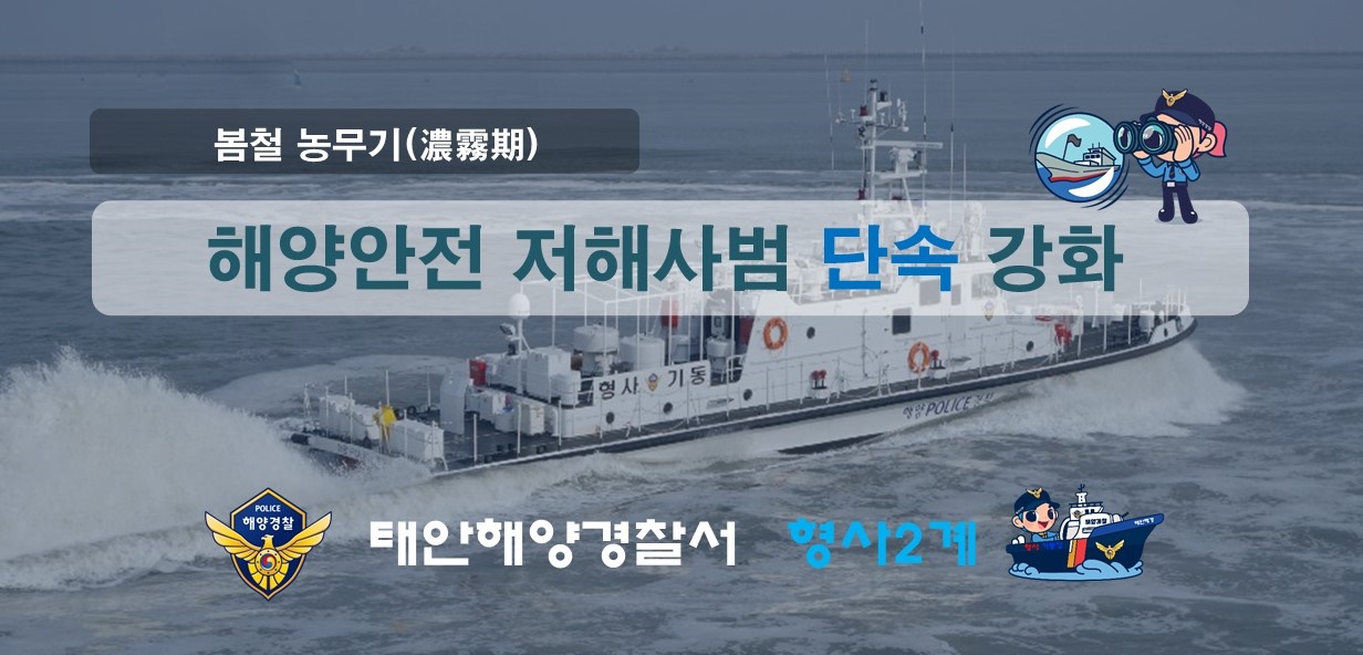 태안해경은 농무기 불안정한 해상 날씨와 게릴라성 짙은 안개로 항해안전에 대한 각별한 주의가 요구됨에 따라 ▶항내 협수로 항법 미준수 ▶음주운항 및 구명조끼 미착용 ▶과승·과속·과적운항 ▶선박위치발신장치 및 소화설비 등 법정설비 미장착 ▶선박 불법 증·개축 등 각종 안전저해 사범에 대한 현장중심 형사활동을 강화해 인적요인에 의한 해양사건·사고와 해양재난 만큼은 철저히 막겠다는 방침이다.