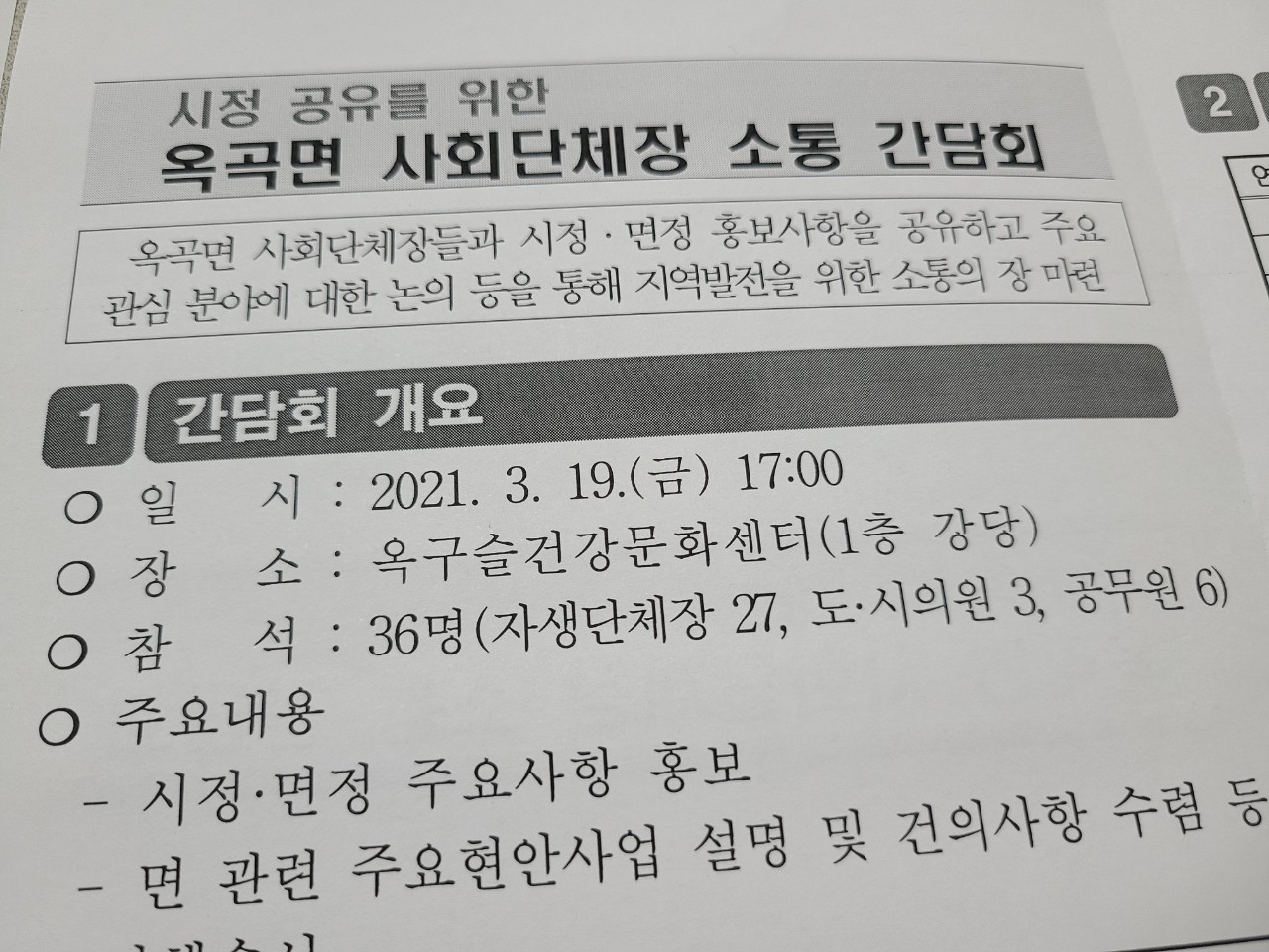 -*옥곡면 관련 주요현안사업 설명 및 건의사항 수렴 등