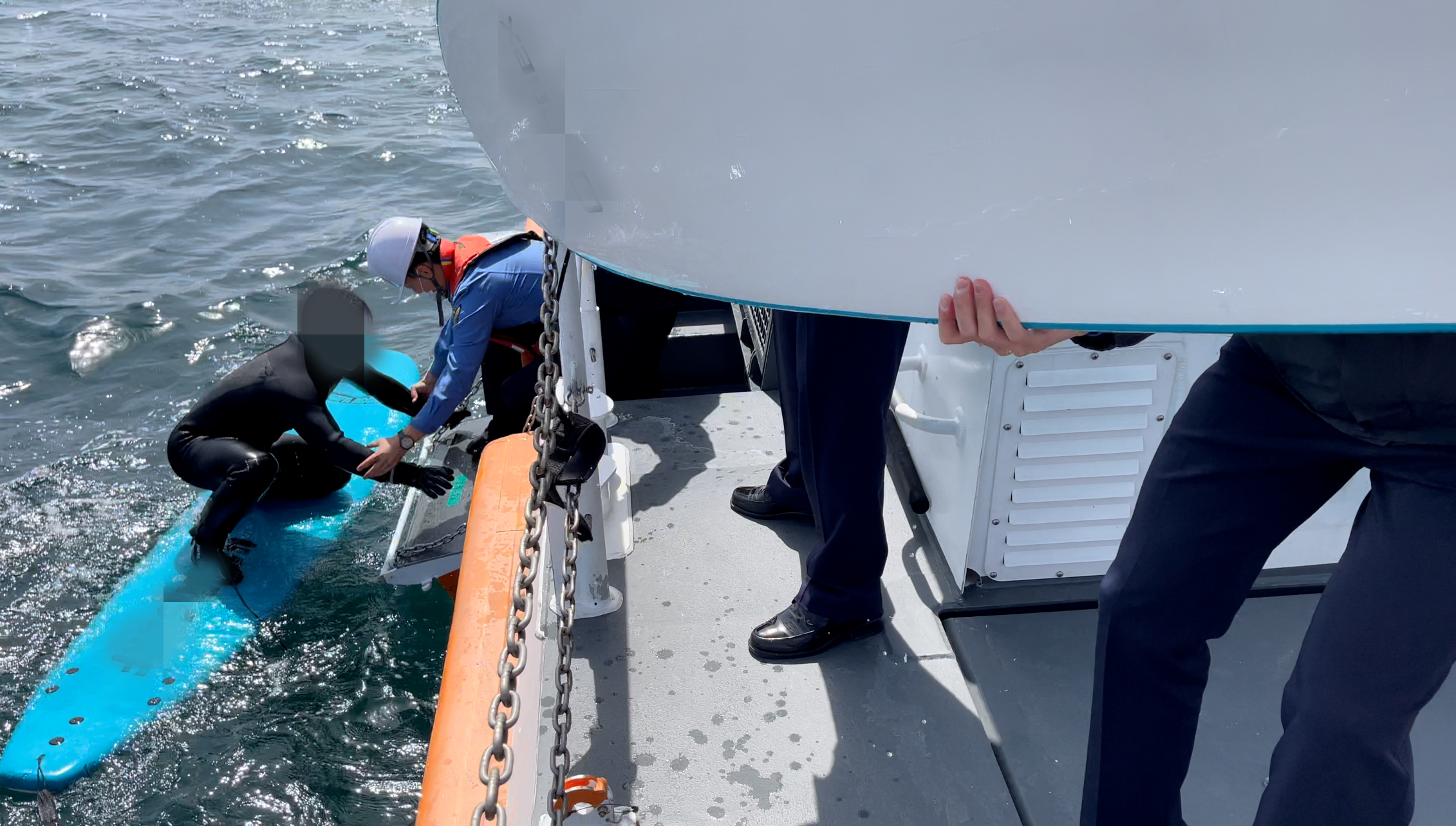 이들은 체력이 소진되어 해변으로 나오지 못하였으며, 저체온증 이외 건강상 별다른 이상이 없어 강릉 사천진항으로 입항해 119 구급차량에 인계하였다.