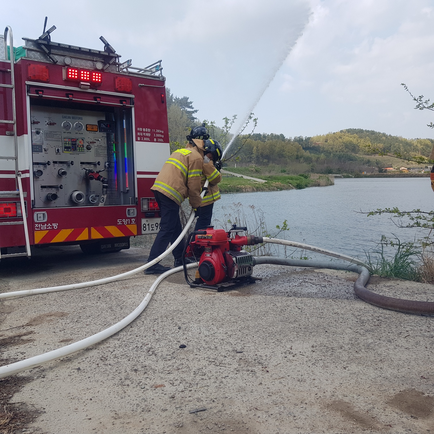 이번 훈련은 화재 발생 시 인근에 소화전 등 소방용수시설이 없는 경우에 소방차 및 동력펌프로 저수지나 하천의 물을 흡수해 방수하는 방식으로 진행됐다.