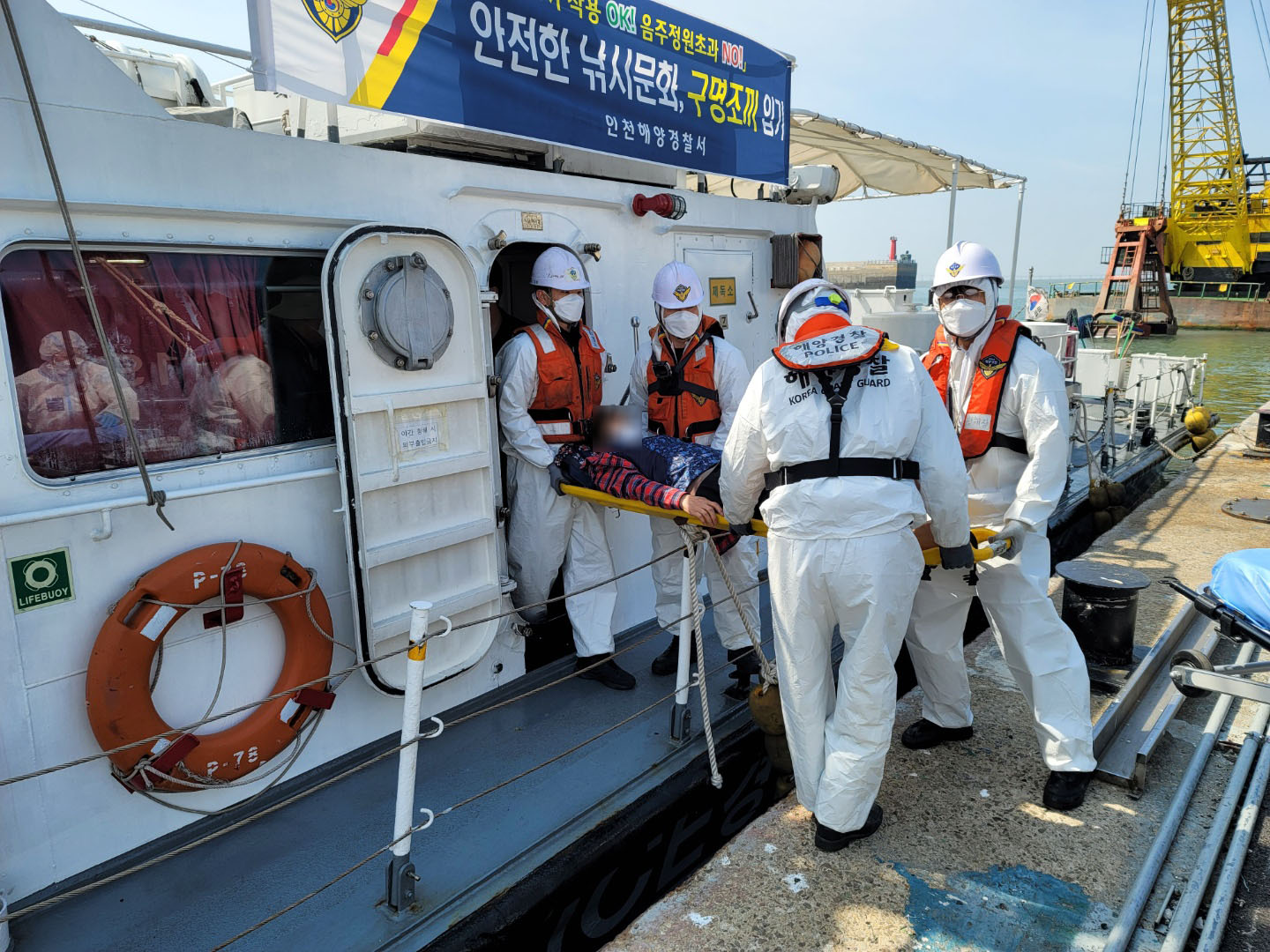 환자는 오전 10 40분경 인천해경 전용부두에 도착 대기 중인 119 구급대에 인계하여 인근 병원으로 이송 치료 중이다
