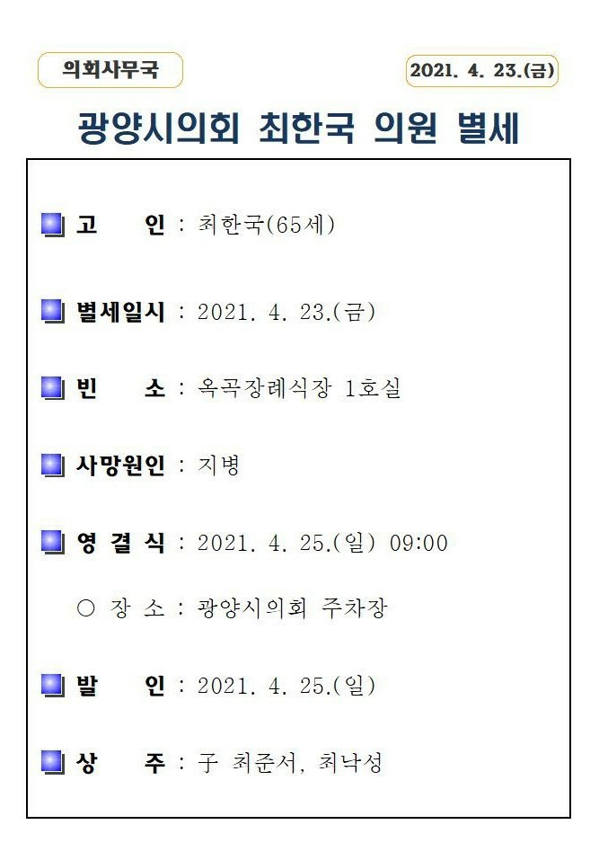 - 광양시의회 관계자에 의하면 최한국 의원이 지병 악화로 4월23일 별세했다고