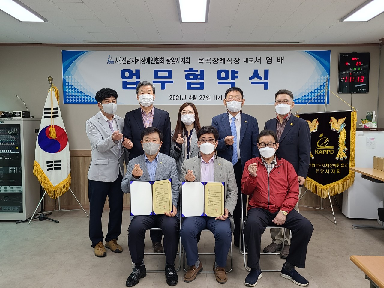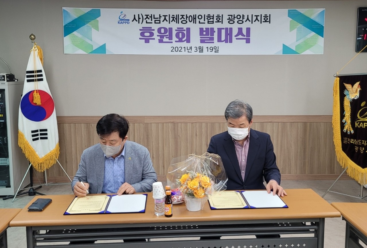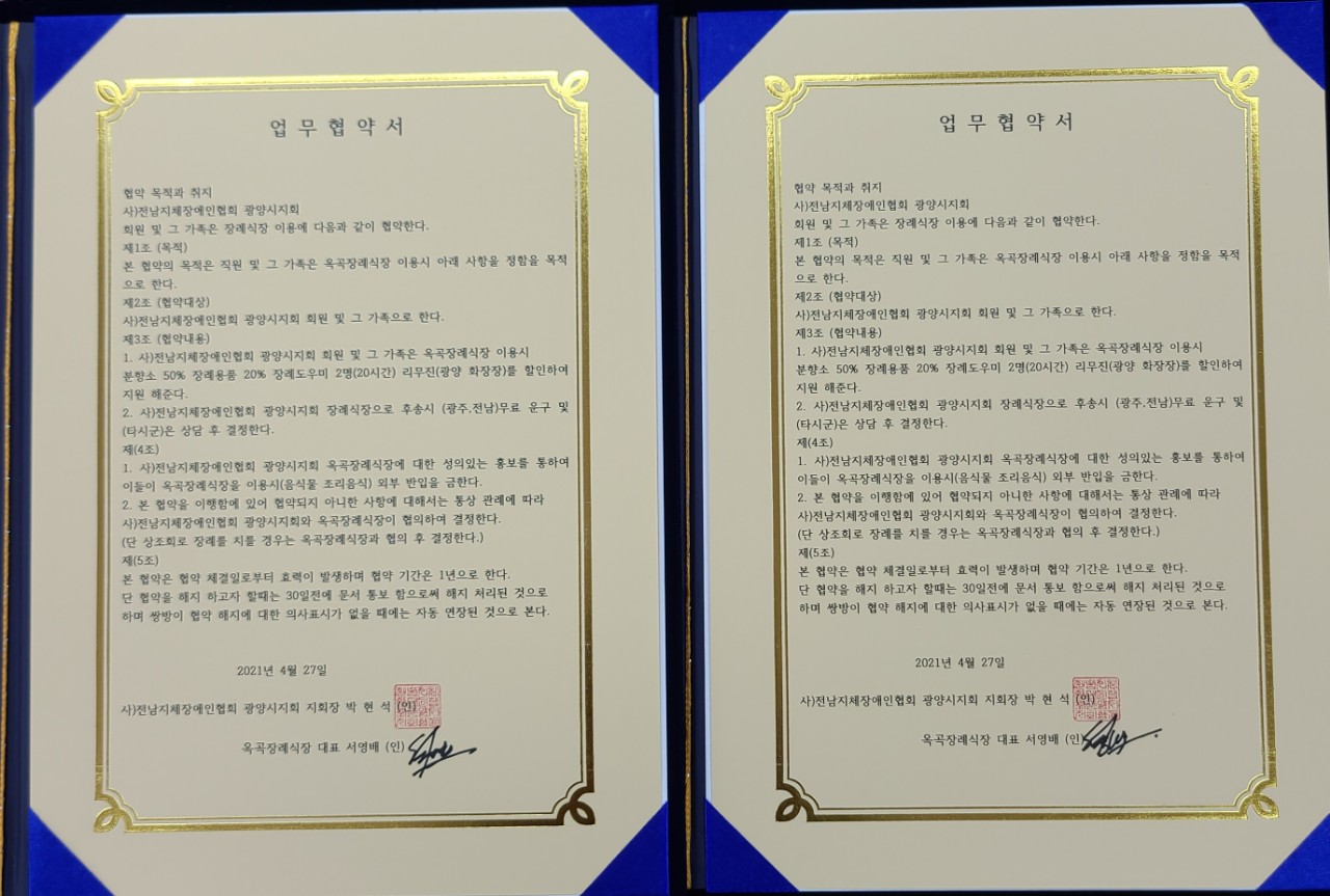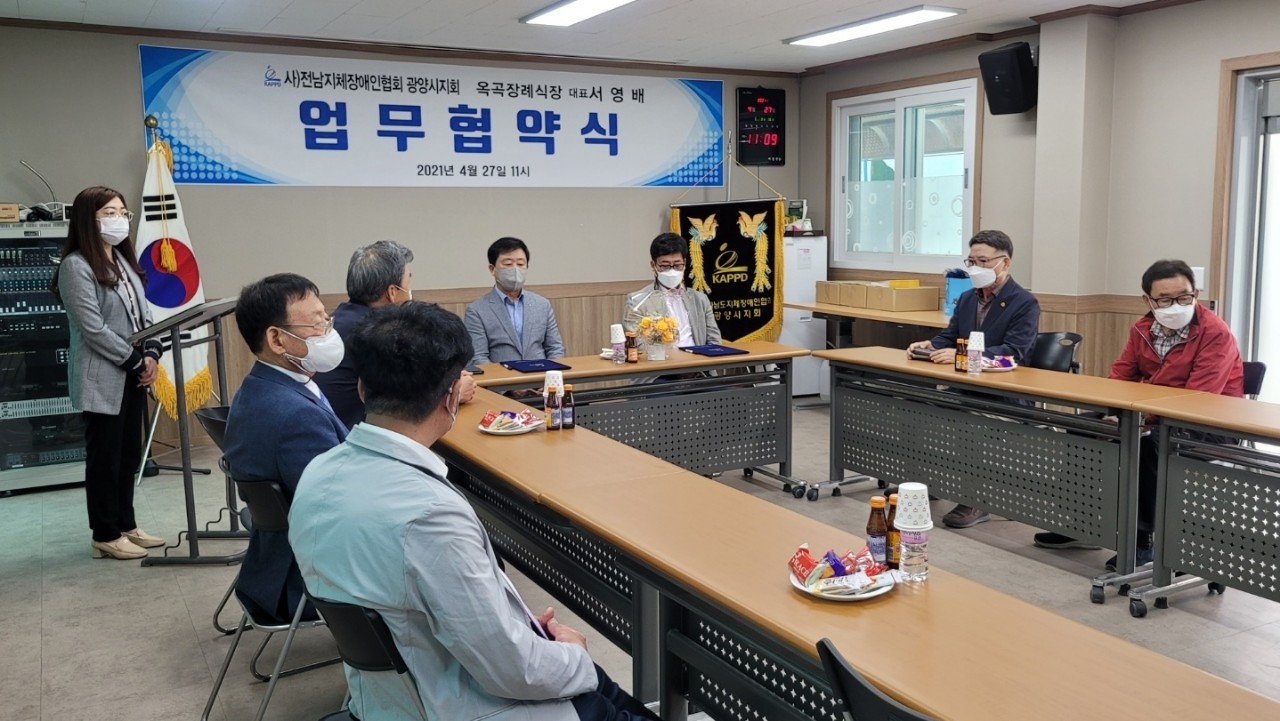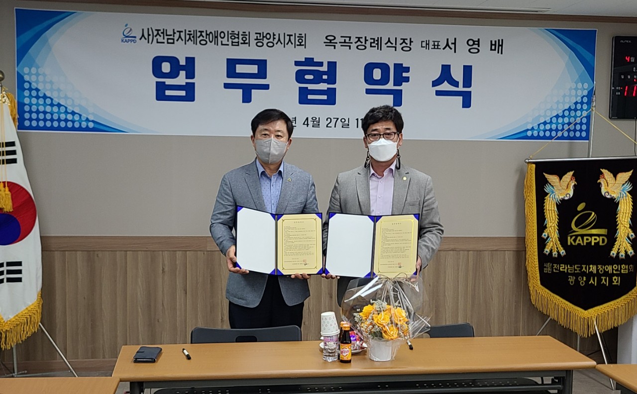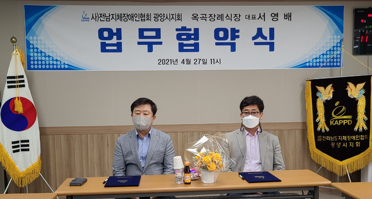 사)전남지체장애인협회 광양시지회(회장 박현석)는 금일(4월27일00시)광양시지회 사무실에서 옥곡장례식장(대표 서영배)와 코로나19에 맞게 관계자들만 초청 소규모 약식으로 MOU(업무상협약식)를 가졌다
