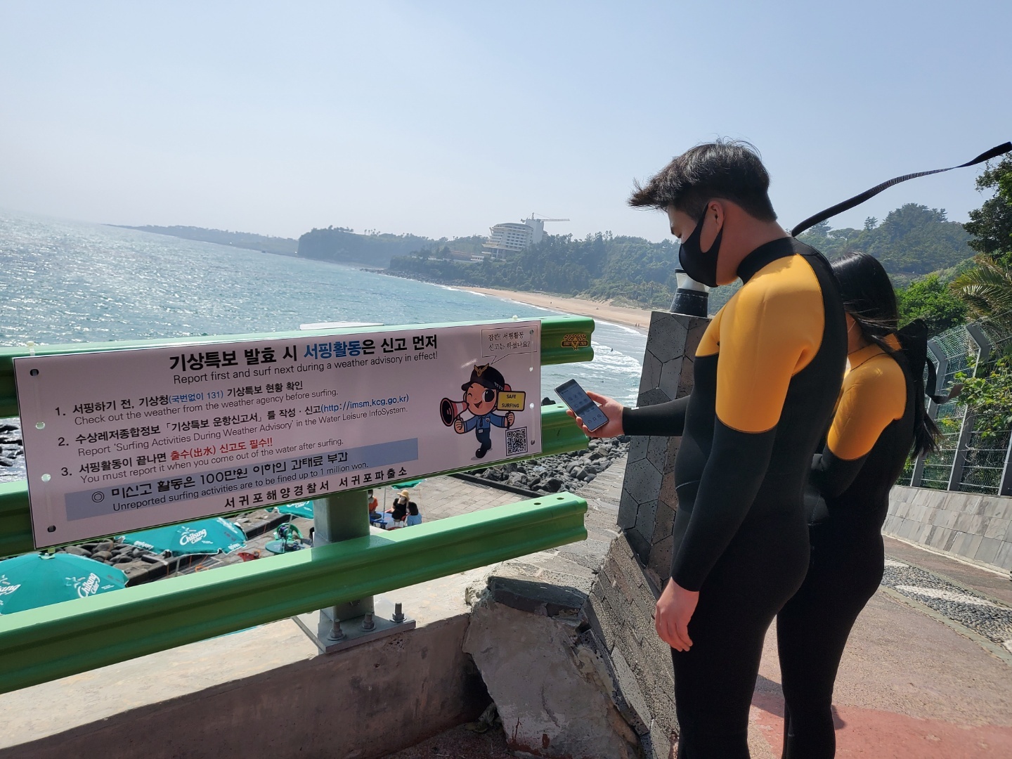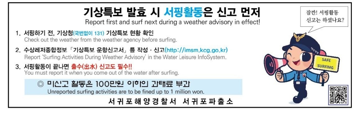 이에 서귀포해경은 서퍼들이 해수욕장으로 진입하는 입구로 들어서면 쉽게 볼 수 있도록 「기상특보 발효시 신고의무」 안내판을 제작·게시하고 스마트폰만 있으면 누구나 손쉽게 수상레저활동 신고할 수 있도록 QR코드를 제작하여 홍보하고 있다. 또한 기상특보 발효 전 CCTV를 활용하여 실시간 활동객을 확인하고 경찰관이 현장 확인하여 신고의무 안내 및 계도로 안전관리를 하고 있다.
