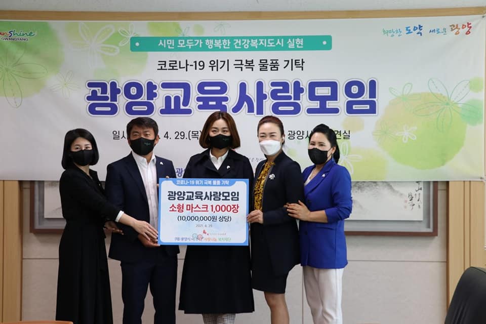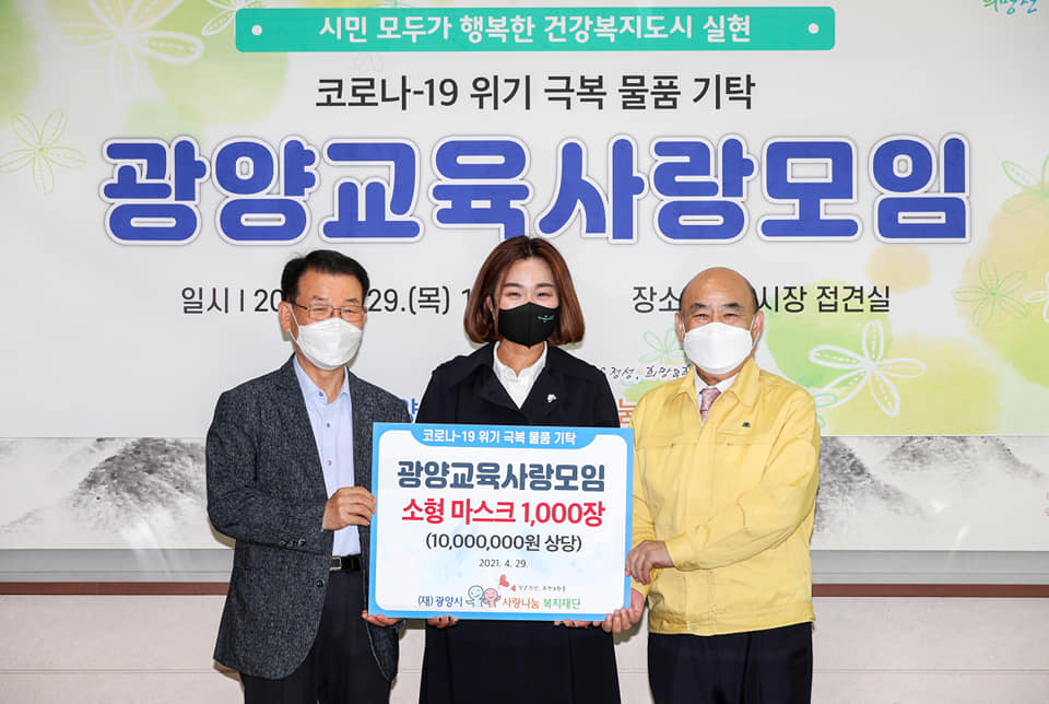 이번에 전달된 마스크는 코로나19 바이러스에 취약한 어린이들을 위해 광양시 어린이집연합회에 기탁했으며 지역 내 어린이집에 전달되어 아이들의 코로나19 감염 예방을 위해 사용된다.