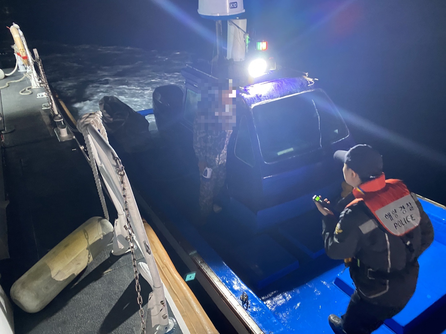 2시간여 추적 끝에 00시 40분경 대천항 북서쪽 약 10㎞ 해상에서 미식별 선박을 발견해 오천파출소 연안구조정 경찰관이 선박에 올라타 검문검색을 실시했다.