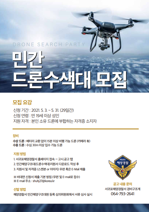 지원자격은 만 19세 이상의 본인 소유 드론 자격증 소지자이며, 한번 이륙하면 배터리 교환없이 15분 이상의 비행능력과 실시간 전송 카메라가 부착된 드론을 보유한 일반 국민이면 누구나 신청 할 수 있다. 지원방법은 서귀포해양경찰서 누리집 고시·공고에서 지원서를 내려받아 작성하여 31일까지 우편 또는 E-Mail로 접수하면 된다. 선정된 대원에게는 대원증을 발급하고 유공자 표창 및 수당지급 등 각종 인센티브를 제공할 예정이다.