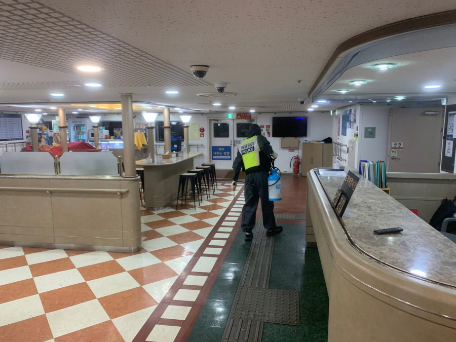여수해경에 따르면 지난 6일 고흥군 도양읍 녹동항에서 녹동파출소와 도양읍사무소 등 4개 기관 30여명이 참석한 가운데 연안여객선터미널과 여객선 등을 상대로 찾아가는 방역 서비스를 진행했다.