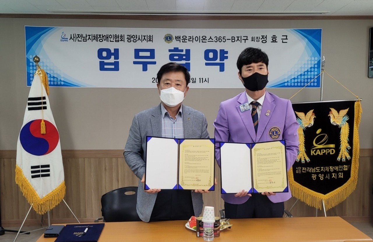 사)전남지체장애인협회 광양시지회(이하 지장협)와 국제라이온스협회355-B3전남동부지구 백운라이온스클럽은 상호 이해와 신뢰를 바탕으로 광양지역 장애인복지 발전을 위해 다음과 같이 협약한다.