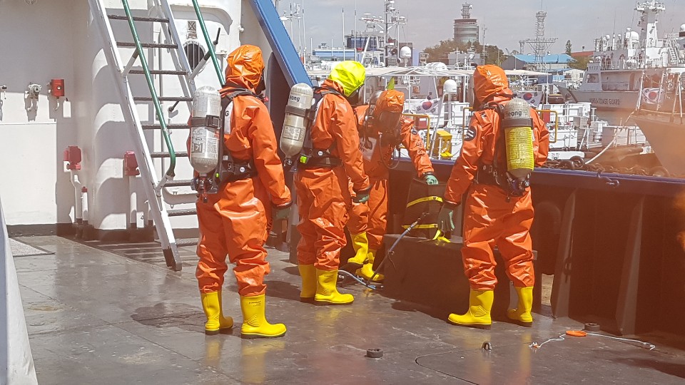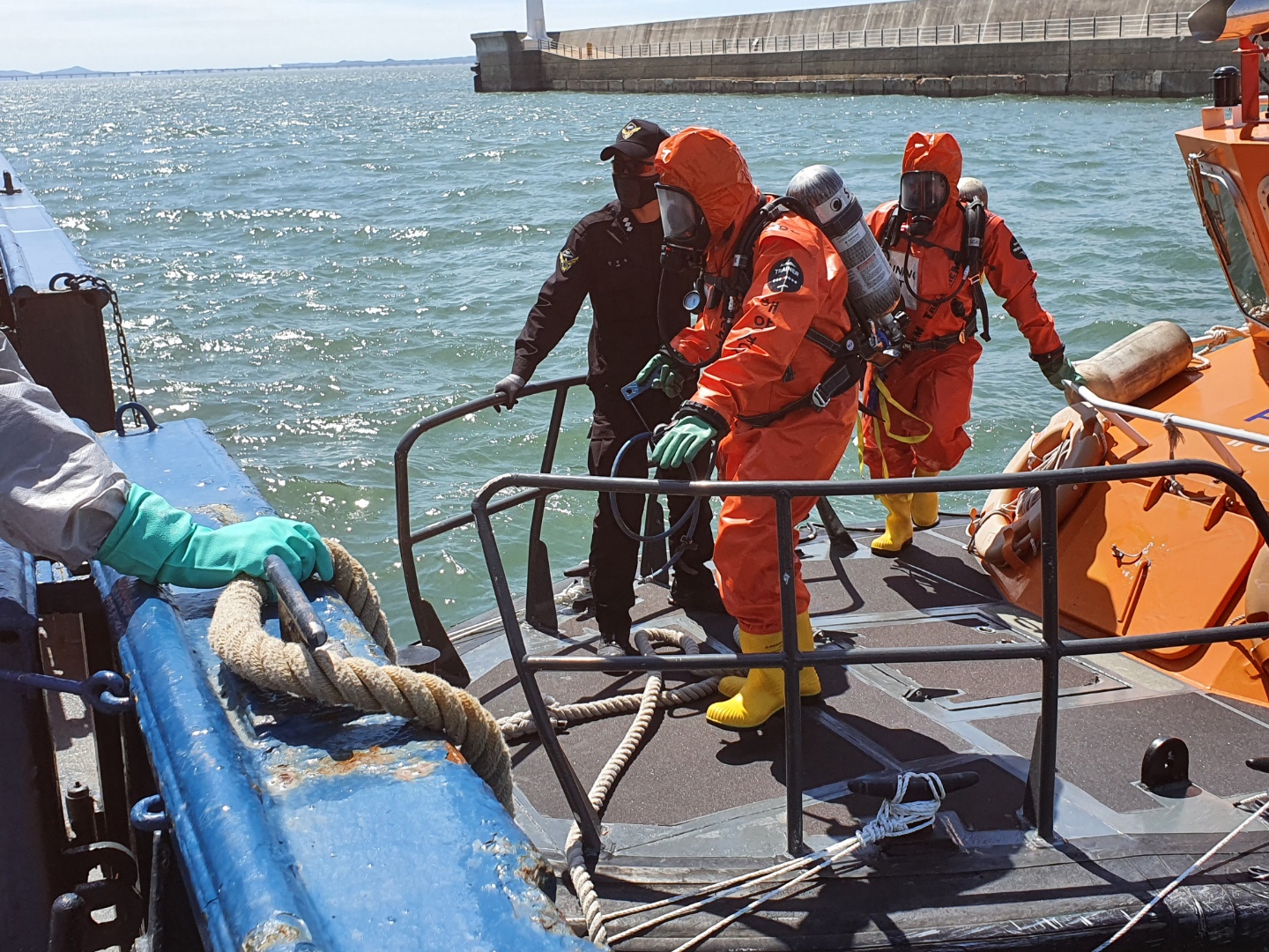 대응훈련에는 열화상카메라, 복합가스탐지기, 화학보호복, 구조장비 등 화학사고 대응 장비를 동원하여 ▲화학물질의 측정 및 탐지 ▲선박에서 부상자 구조 ▲누출방지밴드를 이용한 유출구 봉쇄 ▲화학물질 제독 순으로 진행 됐다