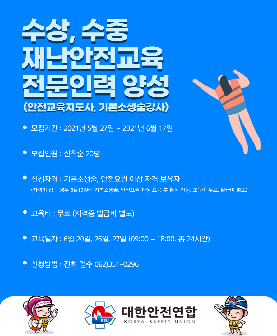 안전사회 구축을 위한 수상,수중,재난안전교육 전문인력 안전교육지도사, 기본소생술강사를 양성한다.