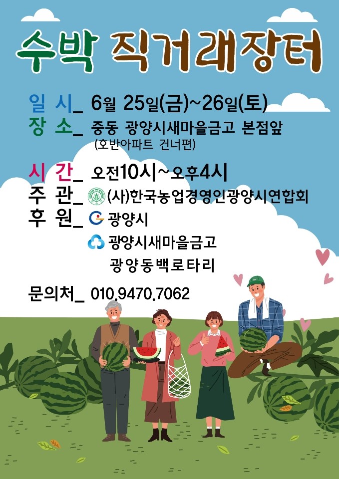 이번 금요일(25일)과 토요일(26일)은 광양시 중동 새마을 금고 본점 앞에서 수박 직거래장터가 열린다.