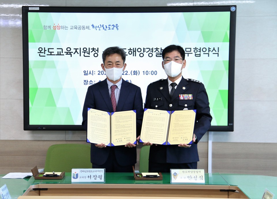 이번 협약식은 코로나 방역수칙을 준수하며 22일 완도교육지원청에서 진행됐으며 완도해경서장, 완도교육장 등 양 기관장과 소속 직원 10명이 참석했다.
