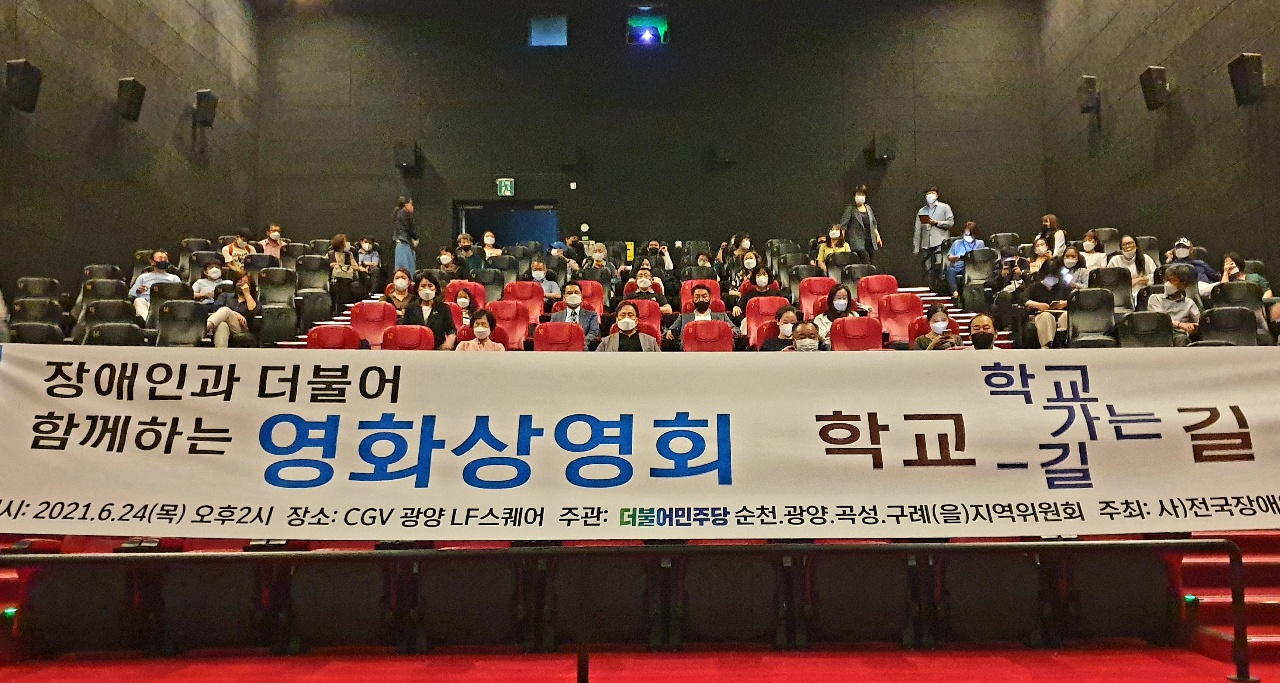 ○ 더불어민주당 순천광양곡성구례(을)지역위원회(위원장 서동용 국회의원)가 주관하고, 사단번인전국장애인부모연대광양시지회가 주최한 영화 <학교 가는 길> 상영회가 광양 엘에프스퀘어 CGV에서 6월 24일(목) 오후 2시에 개최됐다.