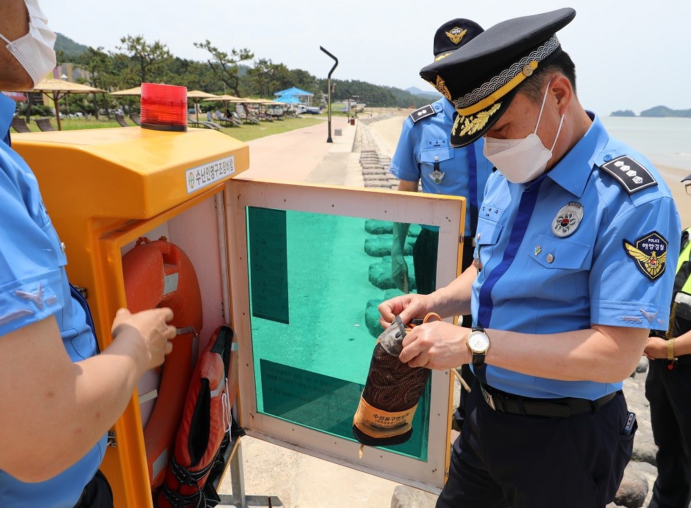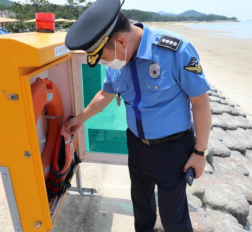 -임재수 목포해양경찰서장이 관내 신안군 임자도 대광해수욕장을 시작으로 여름철 연안 해역 안전사고 예방을 위한 현장점검을 시작했다. -