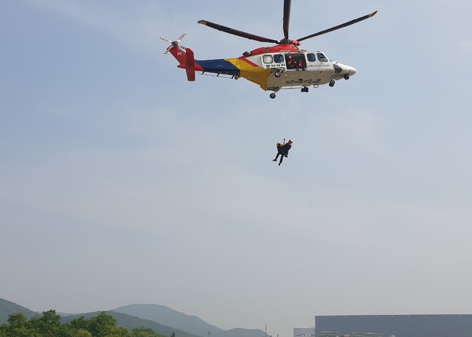 ▲중부지방해경청 회전익 항공대 항공구조훈련장에서 항공구조 훈련 중인 태안해경구조대 ©태안해양경찰서