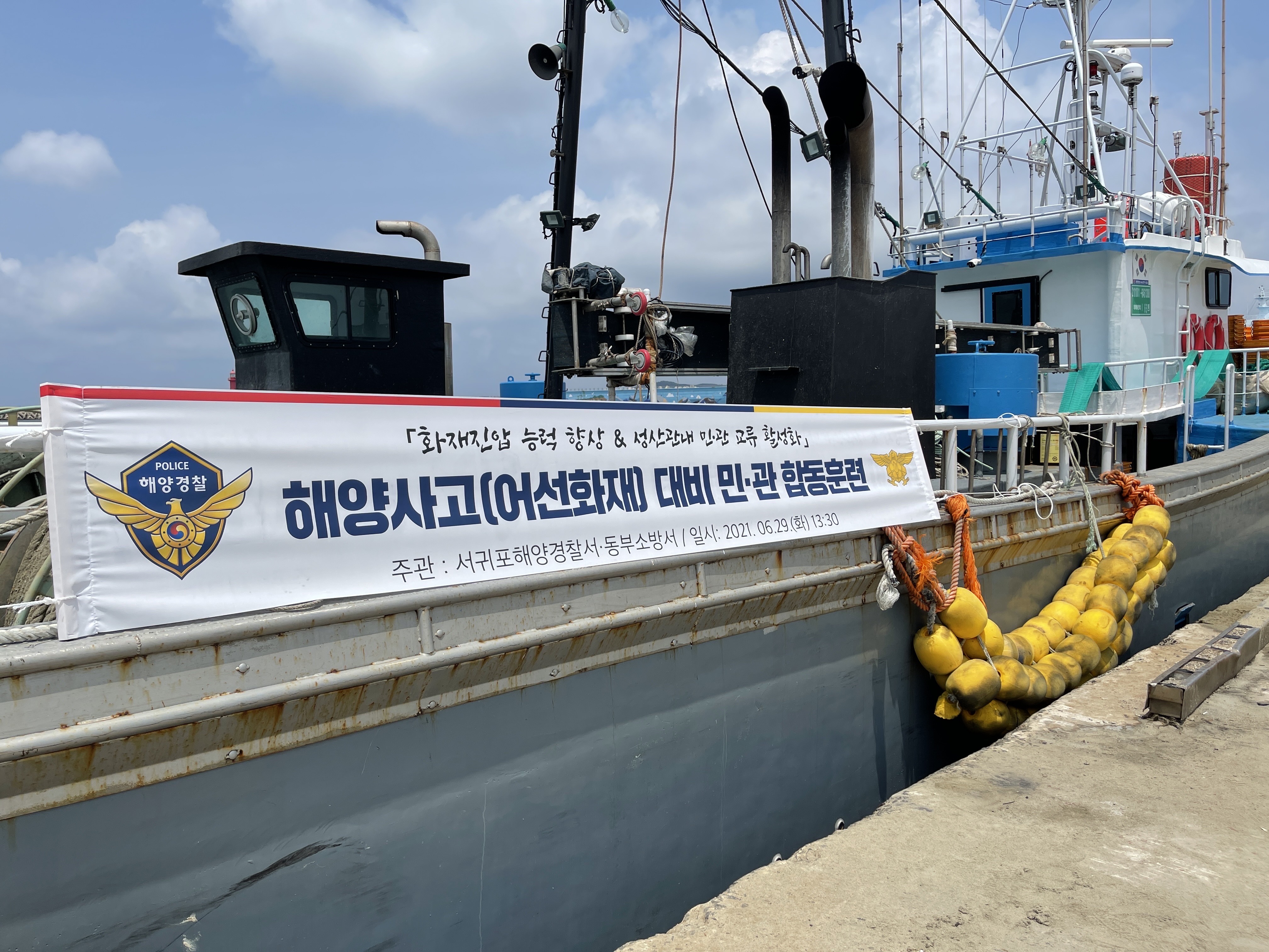 서귀포해양경찰서(서장 도기범)는 29일 서귀포시 성산항 일원에서 항내 계류 어선 화재사고를 가정한 민·관 합동 화재진압 훈련을 실시했다고 밝혔다.