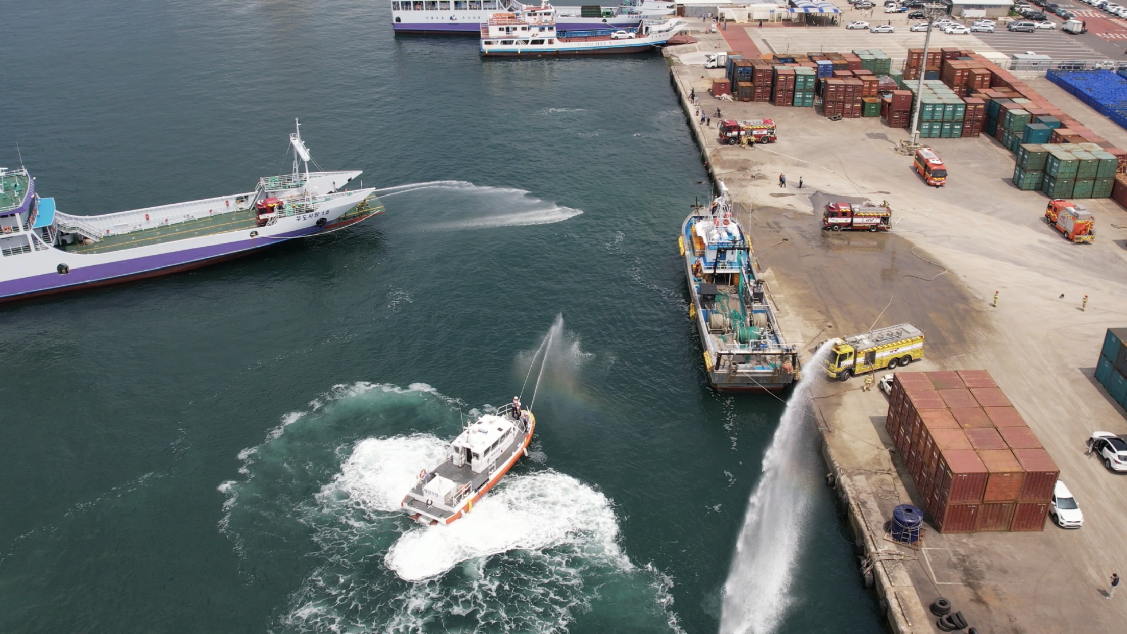 이날 훈련에는 적극행정의 일환으로 서귀포해경서 성산파출소 연안구조정, 우도 도항선 1척, 민간해양구조대 소속 어선 2척 등 선박 5척과 제주동부소방서 소방펌프차 등 7대가 동원되었고, 도선(우도사랑1호)에 소방차를 적재한 후 해·육상에서 입체적으로 소화수를 방출하여 화재를 진압하는 방식으로 진행됐다.