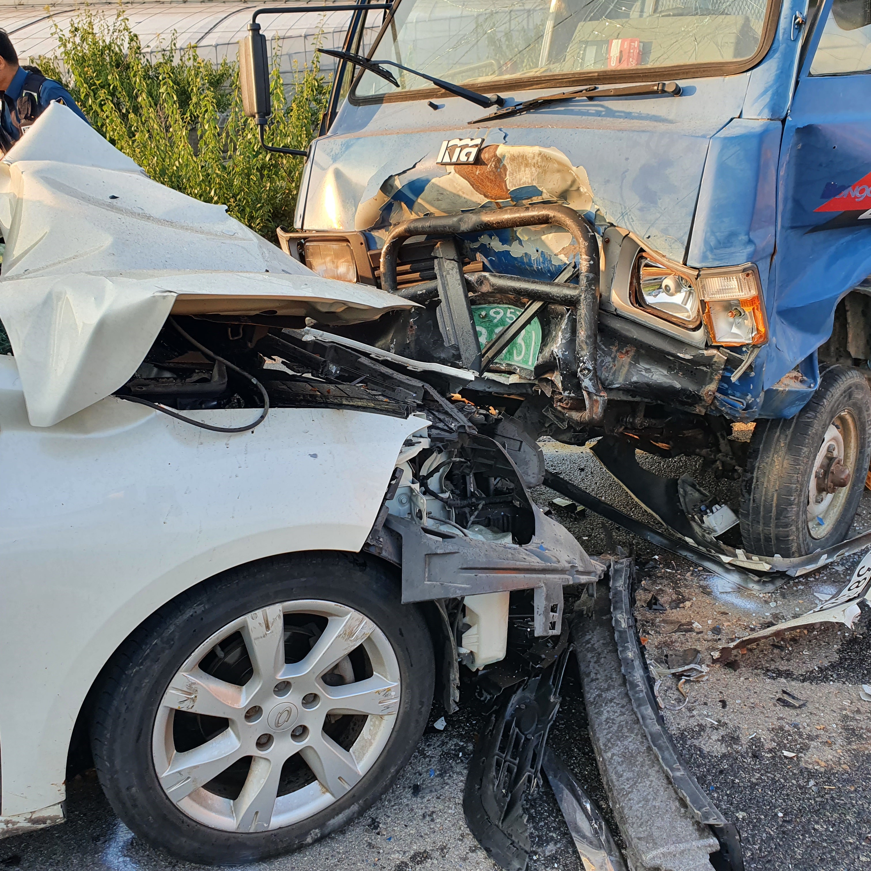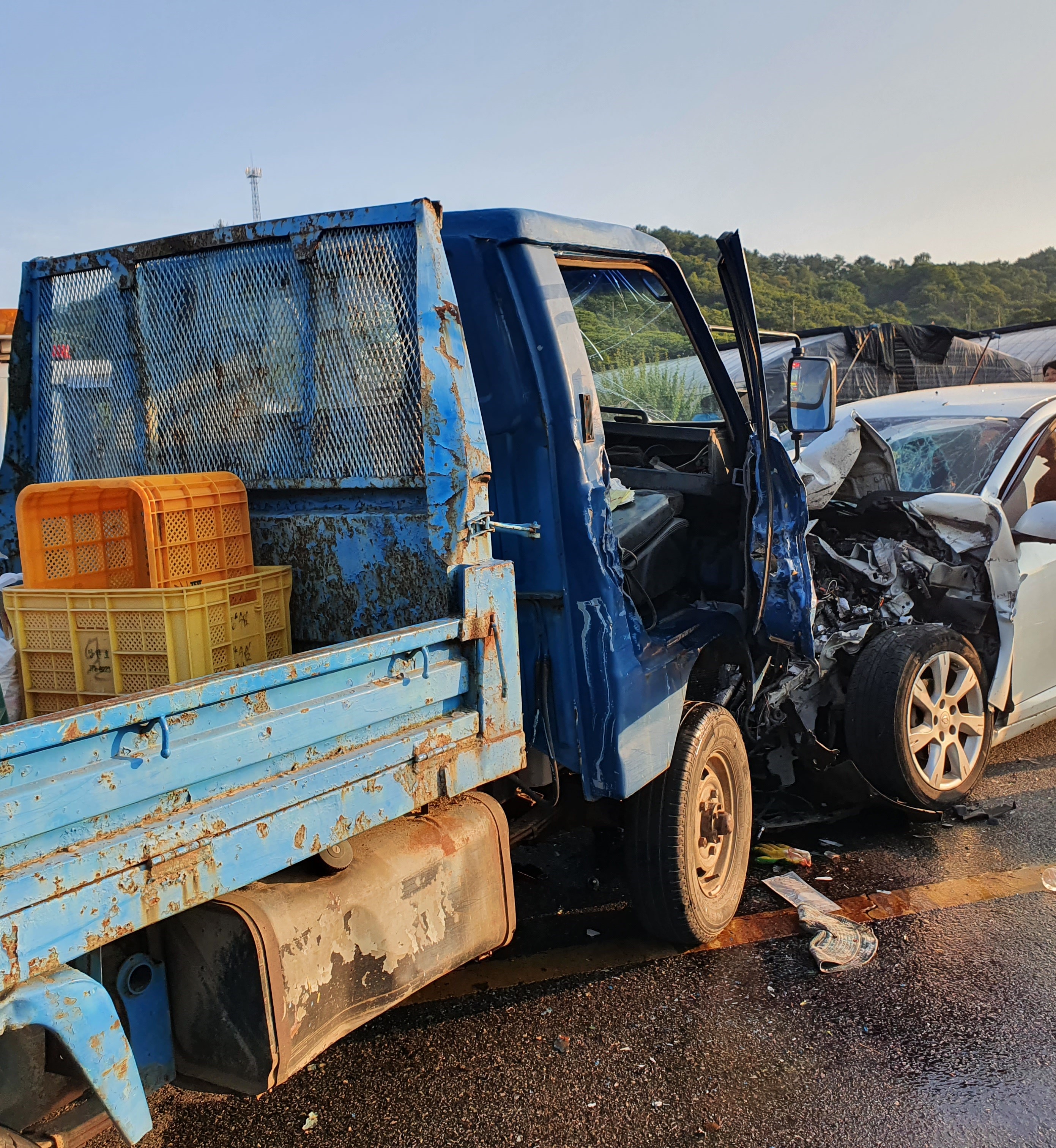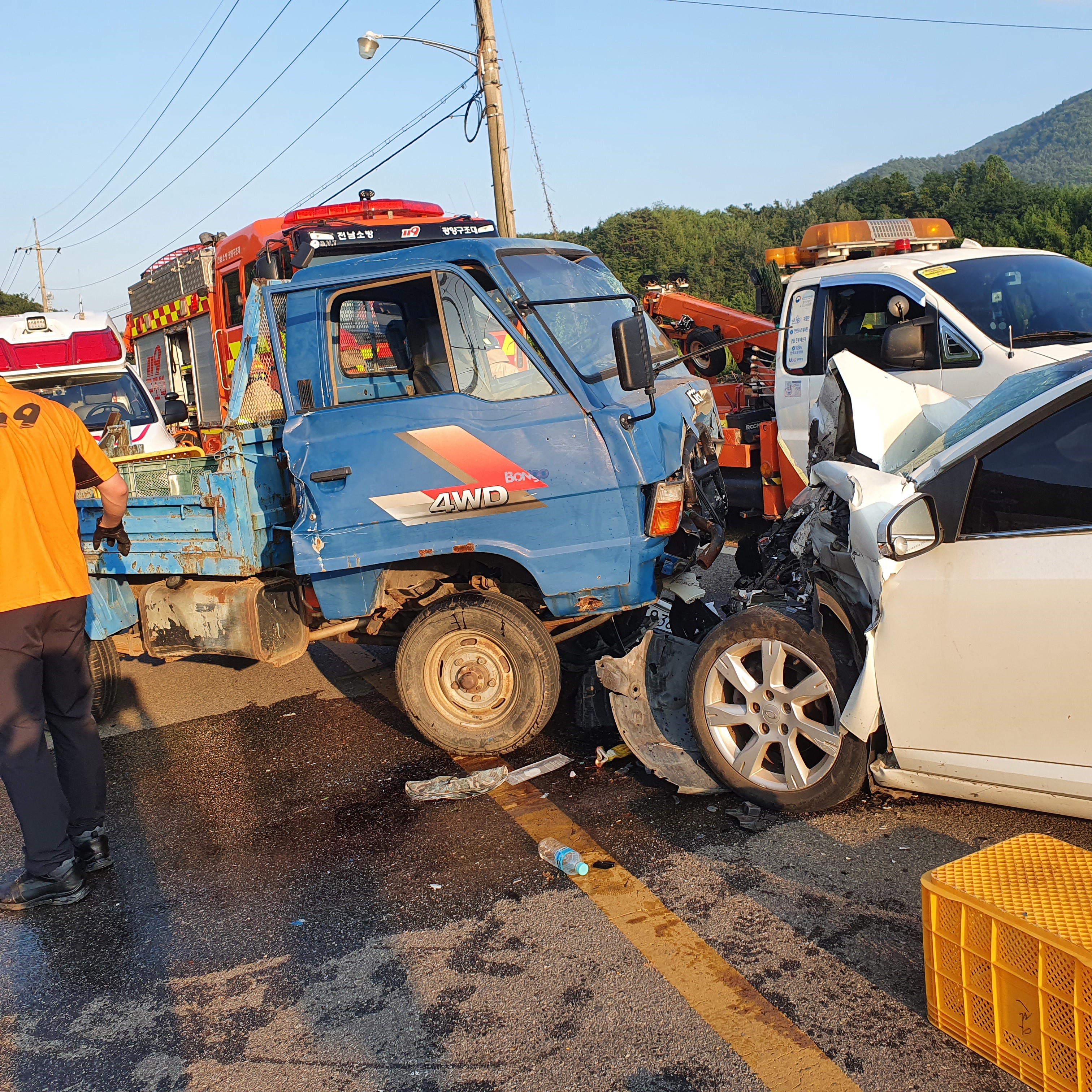 [해륙뉴스1=서정민기자] = 전남 광양시 옥곡면 대리마을서 1톤 화물차 와 승용차 정면 충돌 사고발생