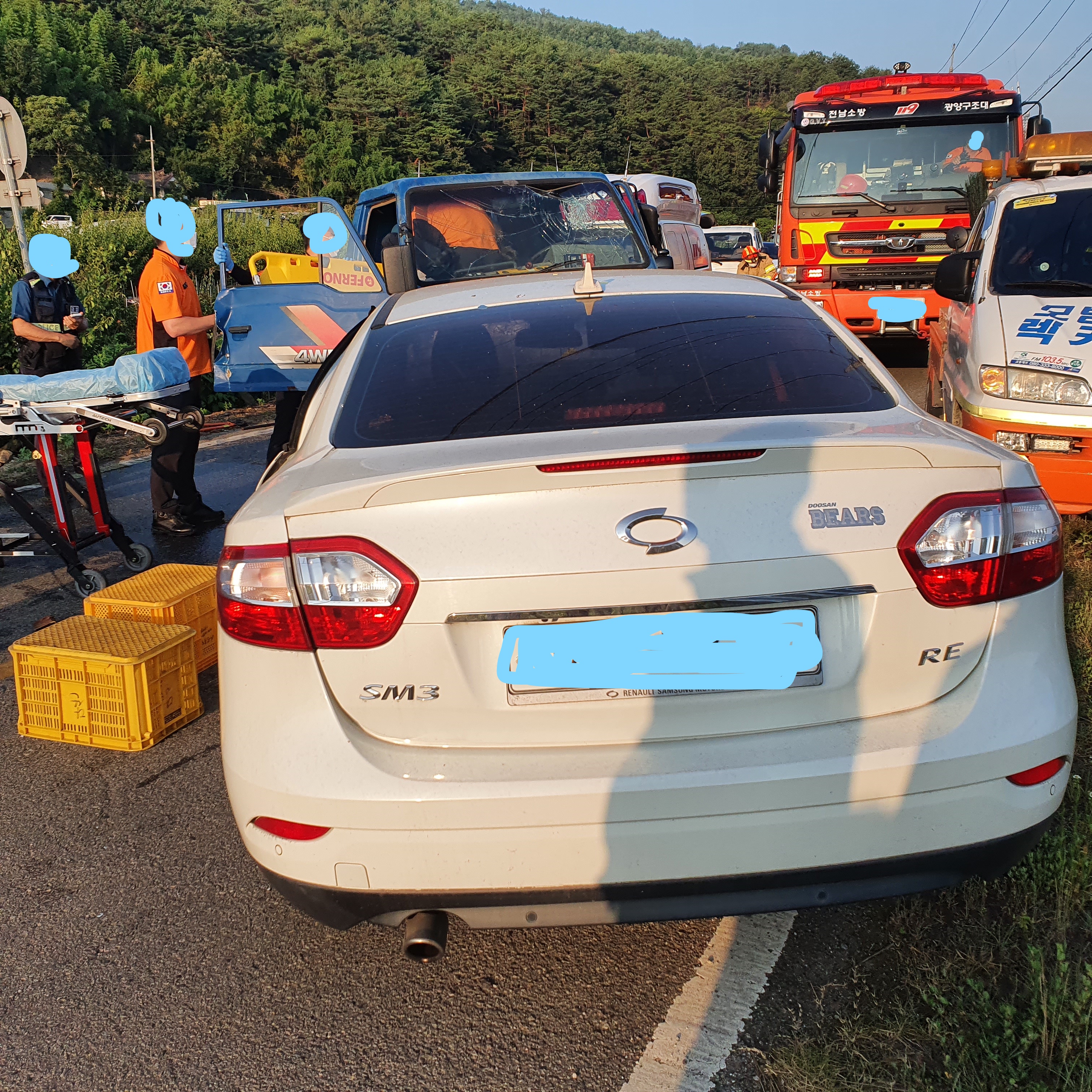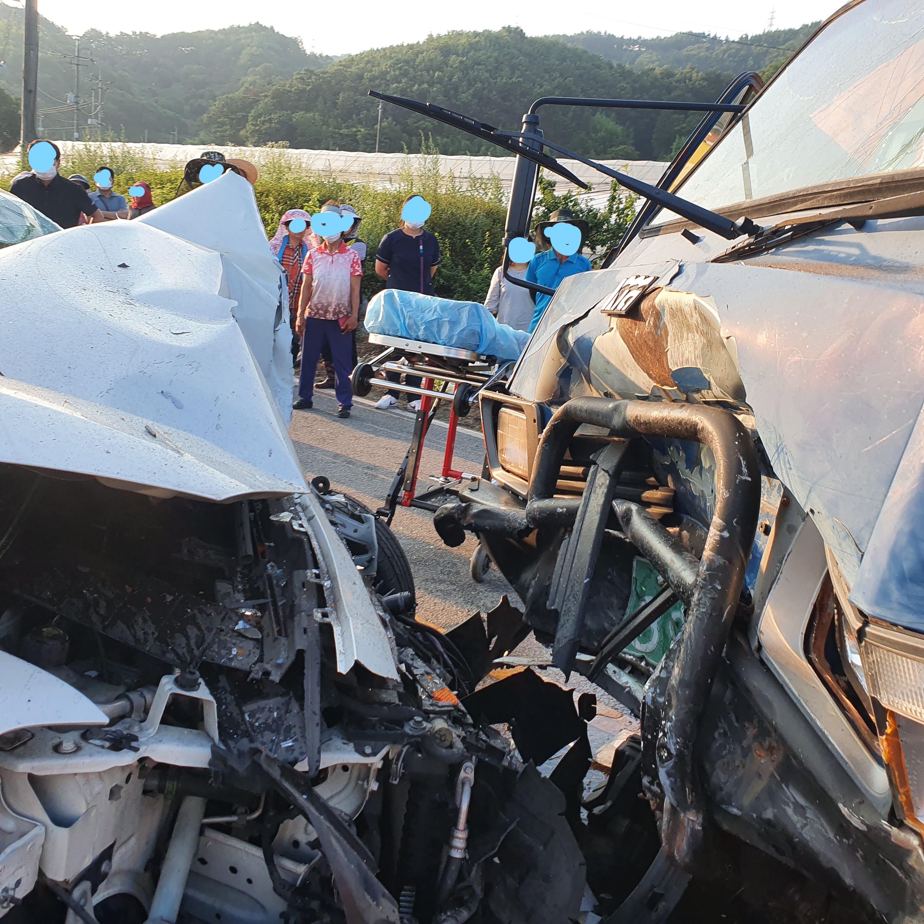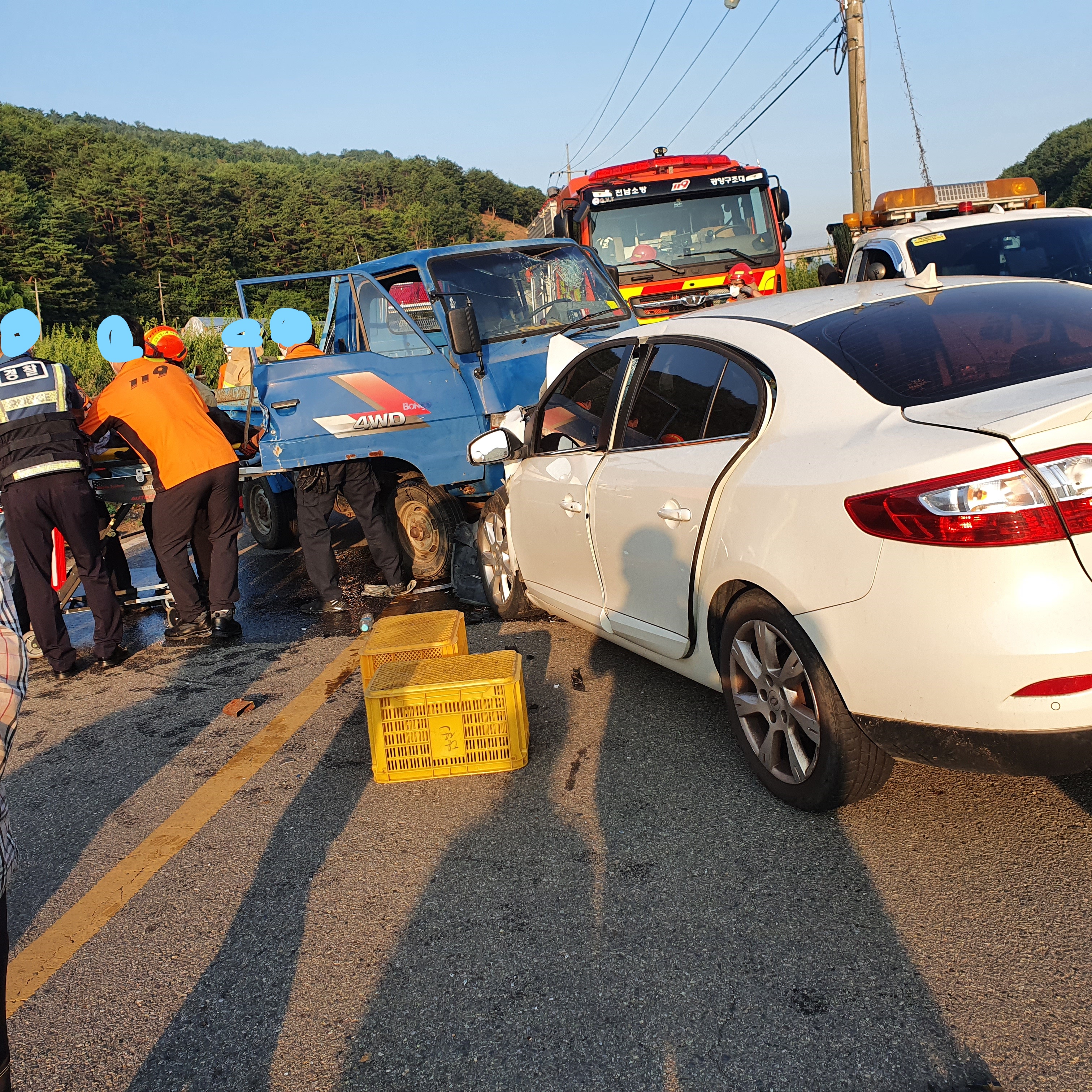 금일(6월30일18시20분경) 광양시 옥곡면.면 소재지에서 수평마을 방면으로 진행하던 1톤 화물차 와 수평마을 방면에서 옥곡면 소재지로 향하던 승용차량간 정면 충돌 사고로