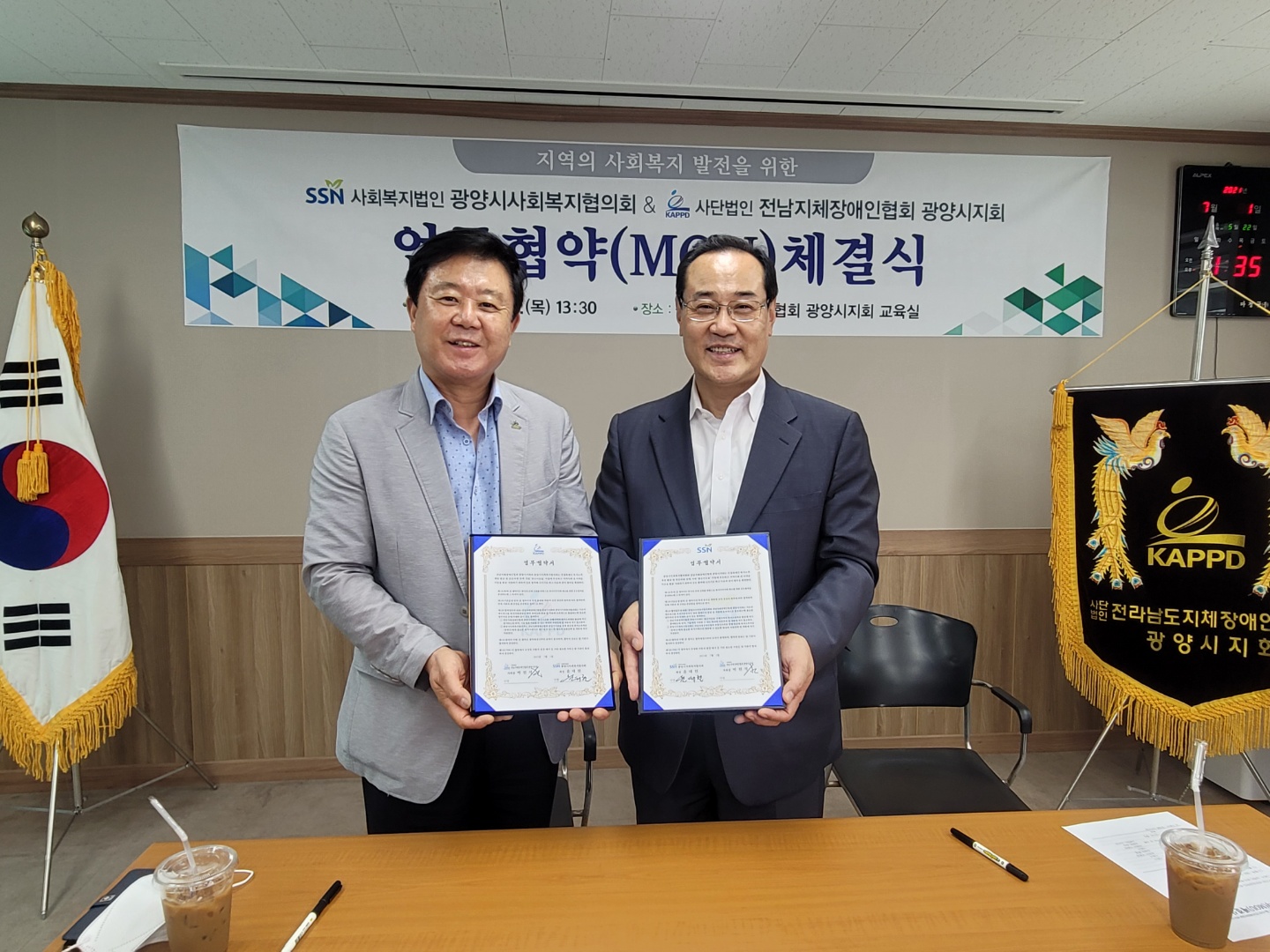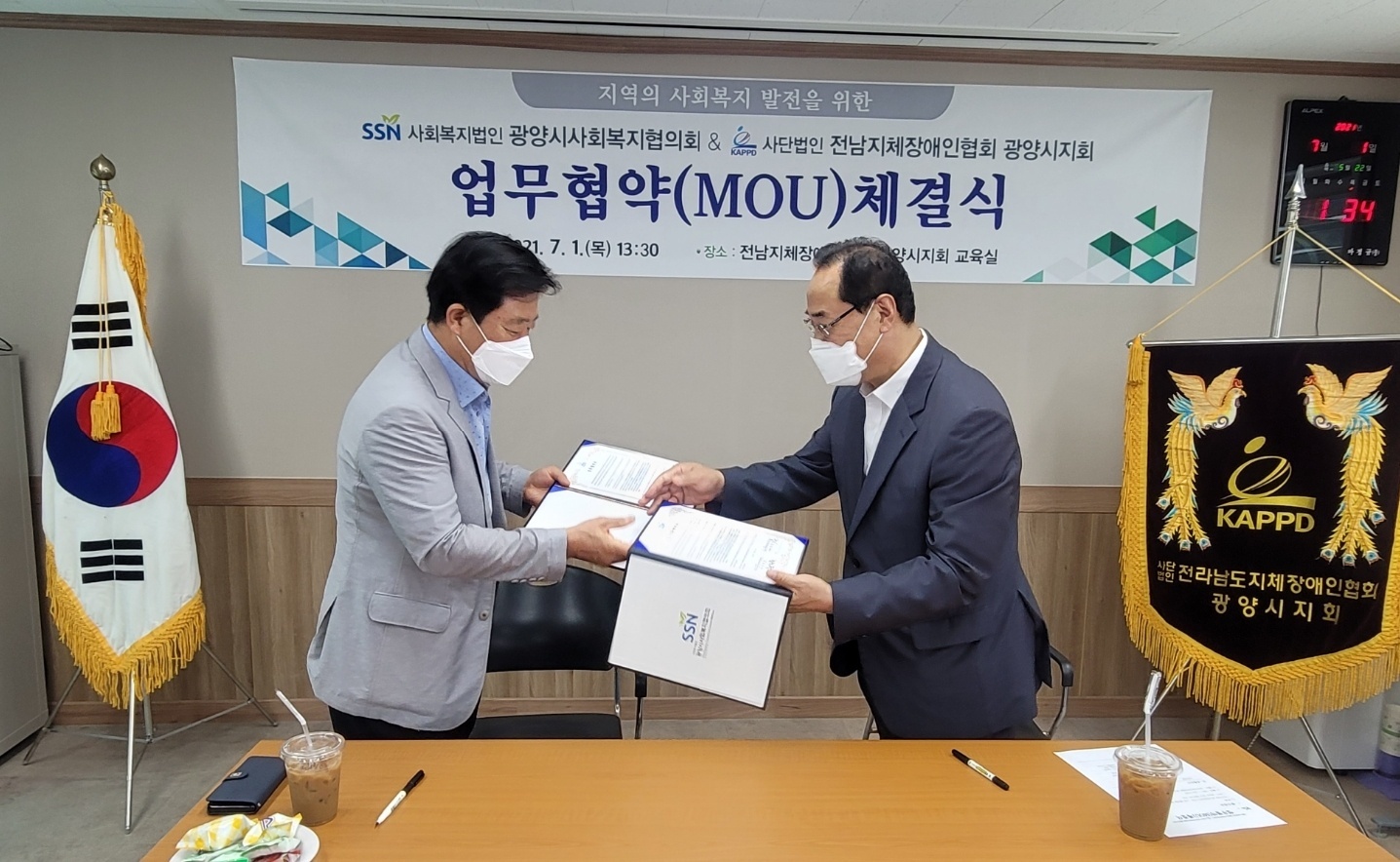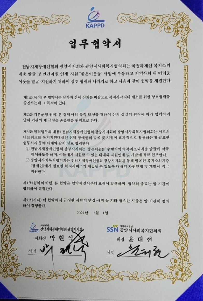 지난(7월1일 13:30분)광양시지회 사무실에서 코로나19에 맞게 사회복지법인 광양시사회복지협의회(회장 윤태현)와 사)전남지체장애인협회 광양시지회(지회장 박현석)가 관계자들과 함께 MOU(업무상협약식)를 가졌다.