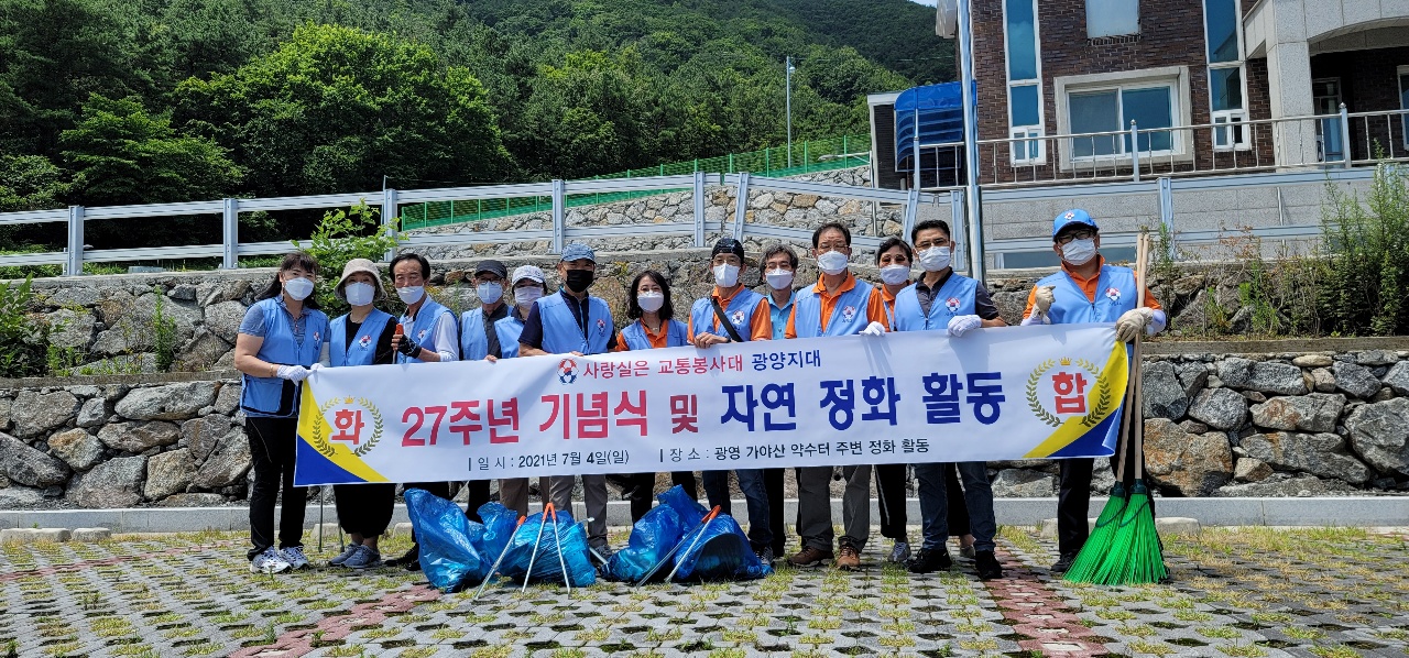 [해륙뉴스1=유경열기자]-광양시 사랑실은 교통봉사대 광양지대(지대장 이봉재) 발대 27주년 기념식(자체행사)을 가야산 약수터 주변 정화작업으로 대신 하였다.