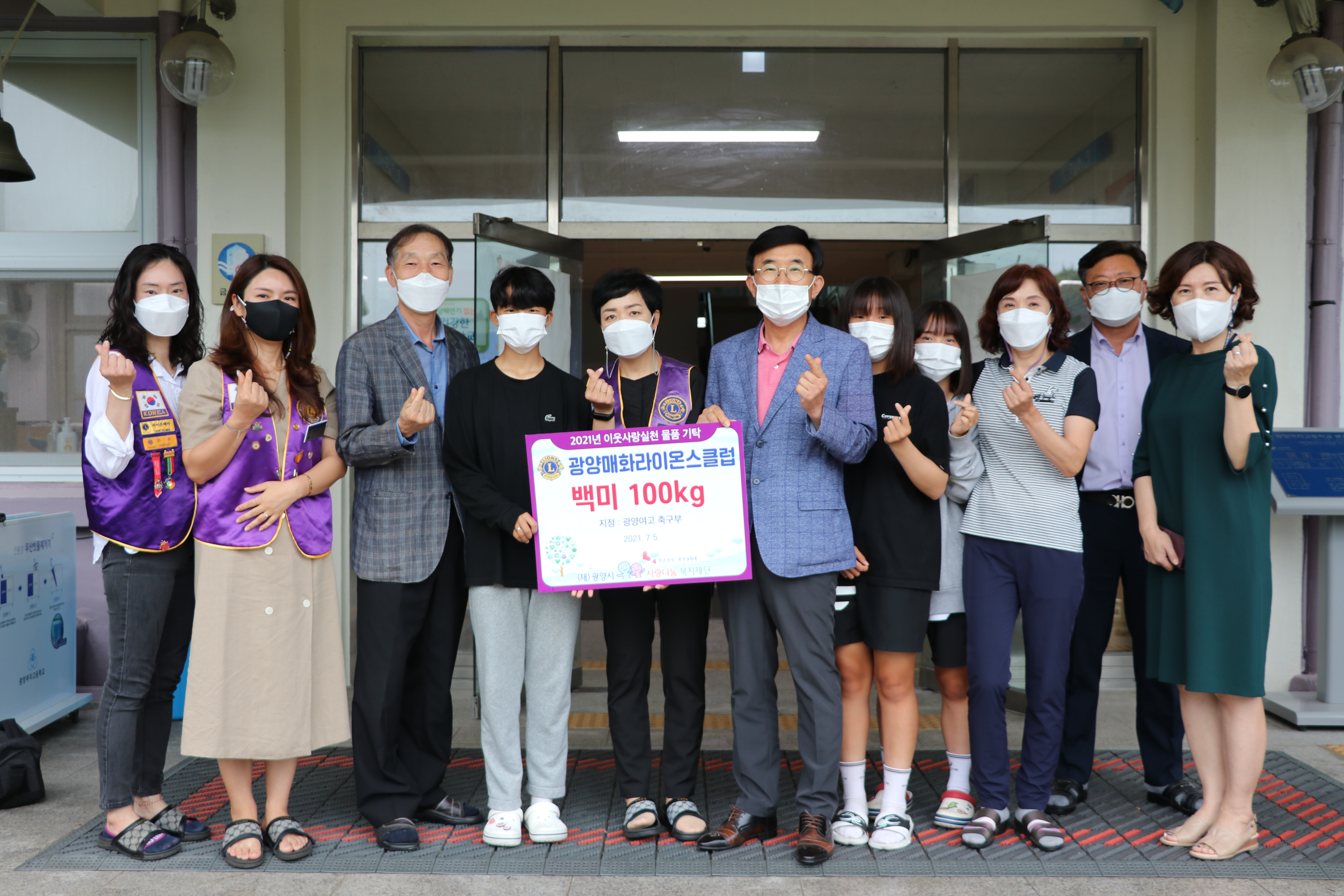 전달된 백미는 광양매화라이온스클럽 이·취임식을 축하하며 화환 대신 받은 것으로, 광양여자고등학교 축구부에 지정기탁 되어 선수들의 식사지원으로 사용될 예정이다.