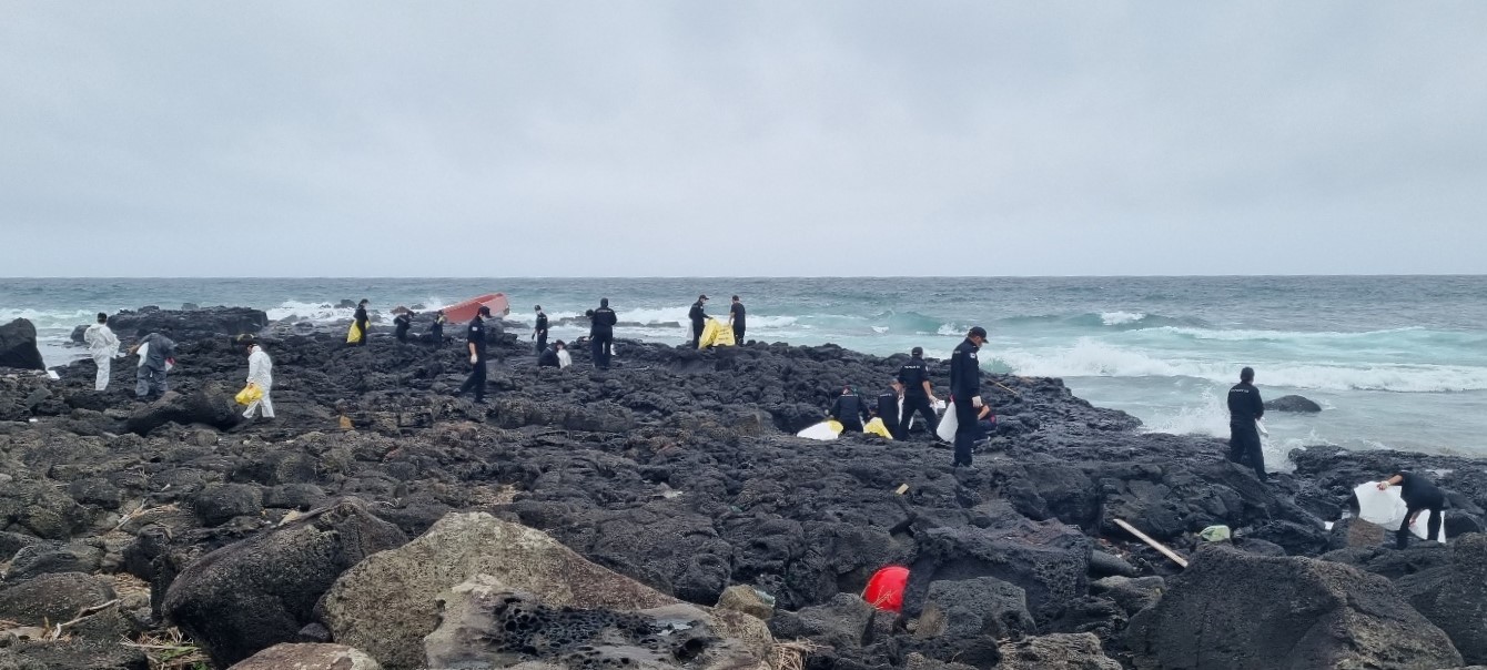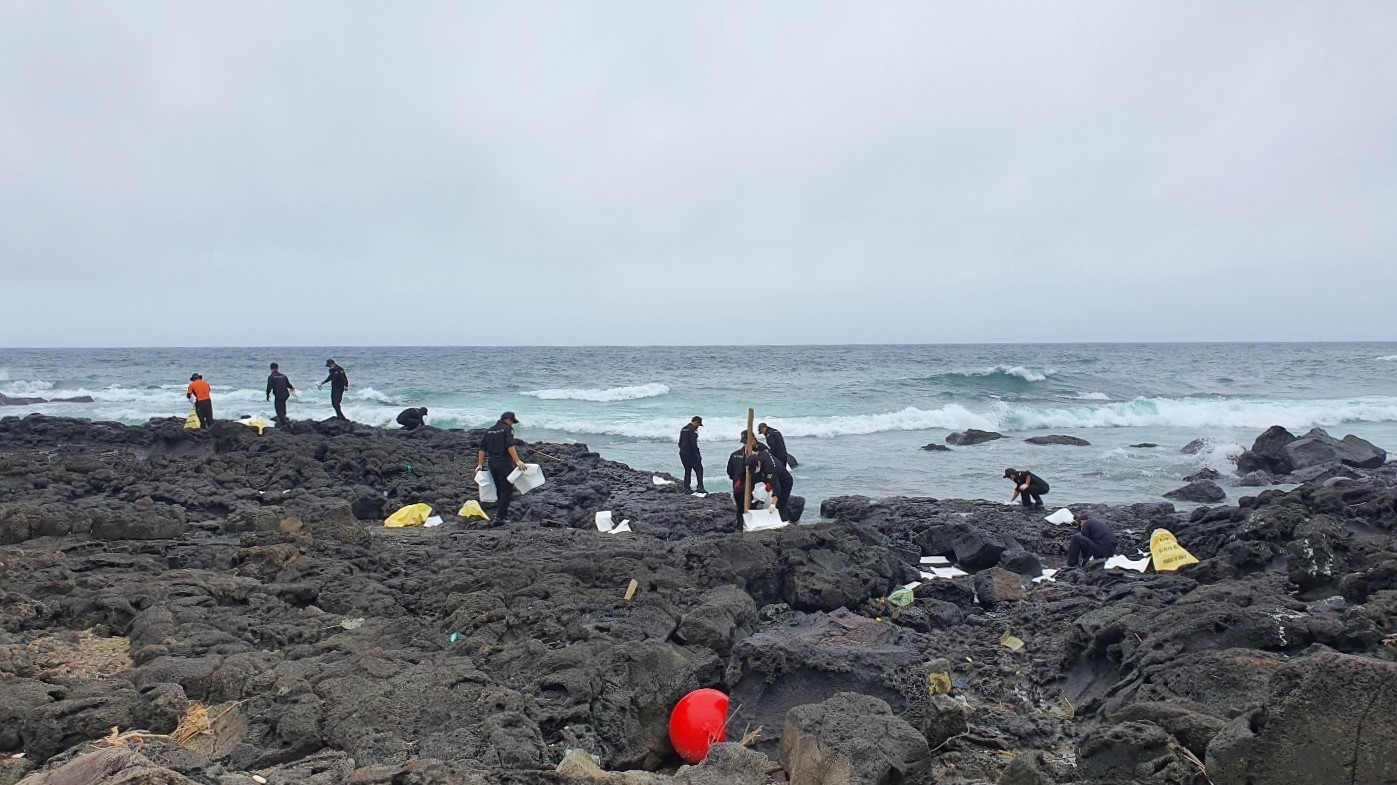 서귀포해경은 가용세력을 총동원해 현장에 급파했고 해양환경공단 등 유관기관과 함께 총 50여 명이 유흡착재, 오일펜스 등 방제기자재를 이용해 방제작업을 진행 중이다.