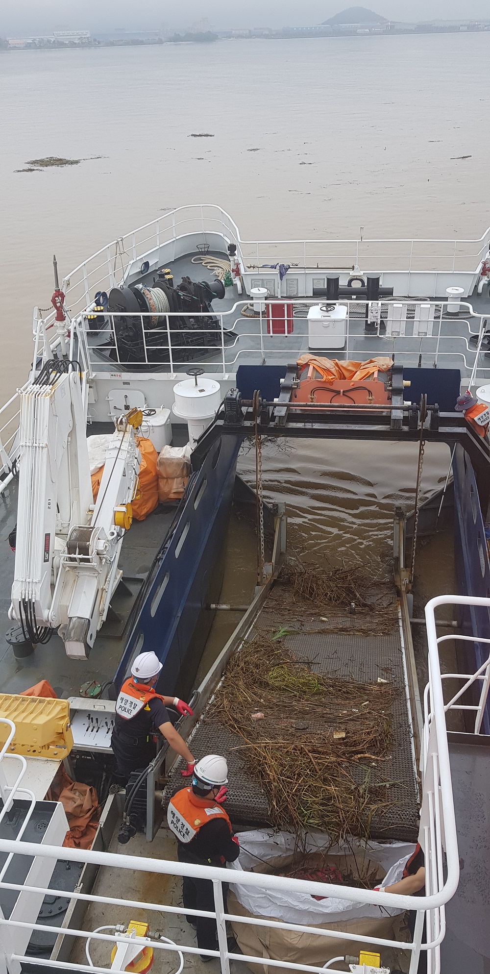 전라남도 지역의 집중호우로 인해 영산강 상류 지역에서부터 유입된 많은 양의 수초 등 쓰레기가 영산강 하구둑과 평화광장 주변으로 떠내려 와 해경이 긴급 수거에 나섰다.