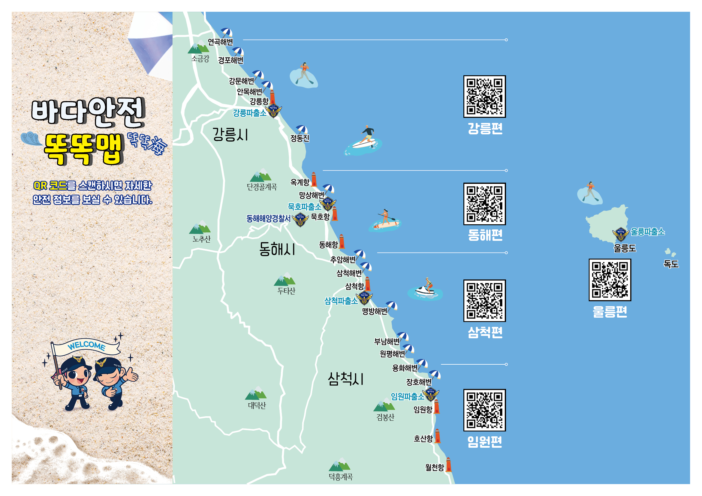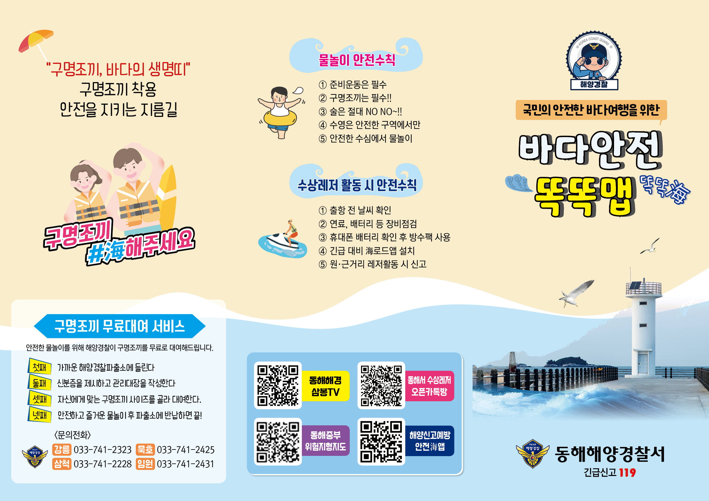 동해해경에 따르면, 해양에 대한 관심증대 및 수상레저 활동 인구가 날로 증가하고 있으나, 국민 대부분은 바다 안전에 관한 경험, 지식 부족으로 많은 위험에 노출되어 있어, 동해안 5개 권역별로(강릉, 동해, 삼척, 임원, 울릉) 다양한 바다안전 정보가 수록 된 ‘바다안전 똑똑맵’을 제작·배포하게 되었다.