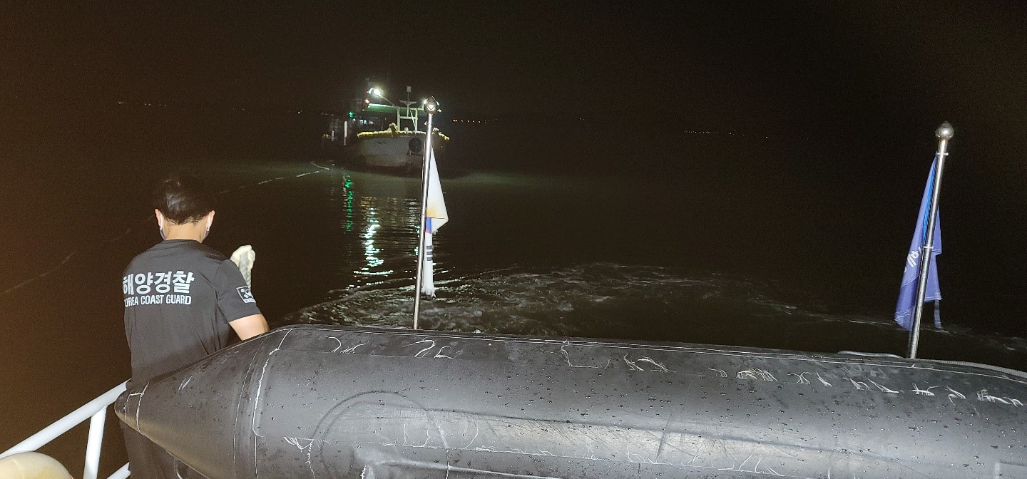 현장에 출동한 하늘바다파출소 연안구조정은 저수심 산재로 우회 접근하여 승조원의 건강상태 등을 확인하고 인근 항포구까지 구조 조치했다