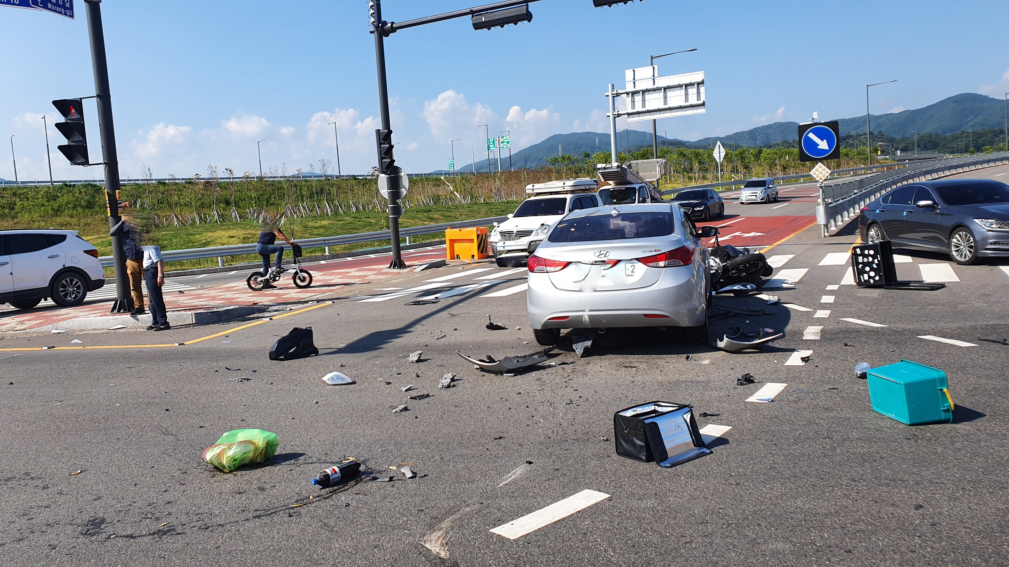 사고현장의 도로는 편도4차선 도로로서 1차선 좌회전. 2.3차선 직진. 4차선 우회전 도로이며 이륜차는 광영에서 옥곡 나들목 방면으로 직진.승용차는 옥곡 나들목에서 자동차 전용도로 방면으로 좌회전 하면서 신호위반 사고로 정면 충돌한 사고이다.