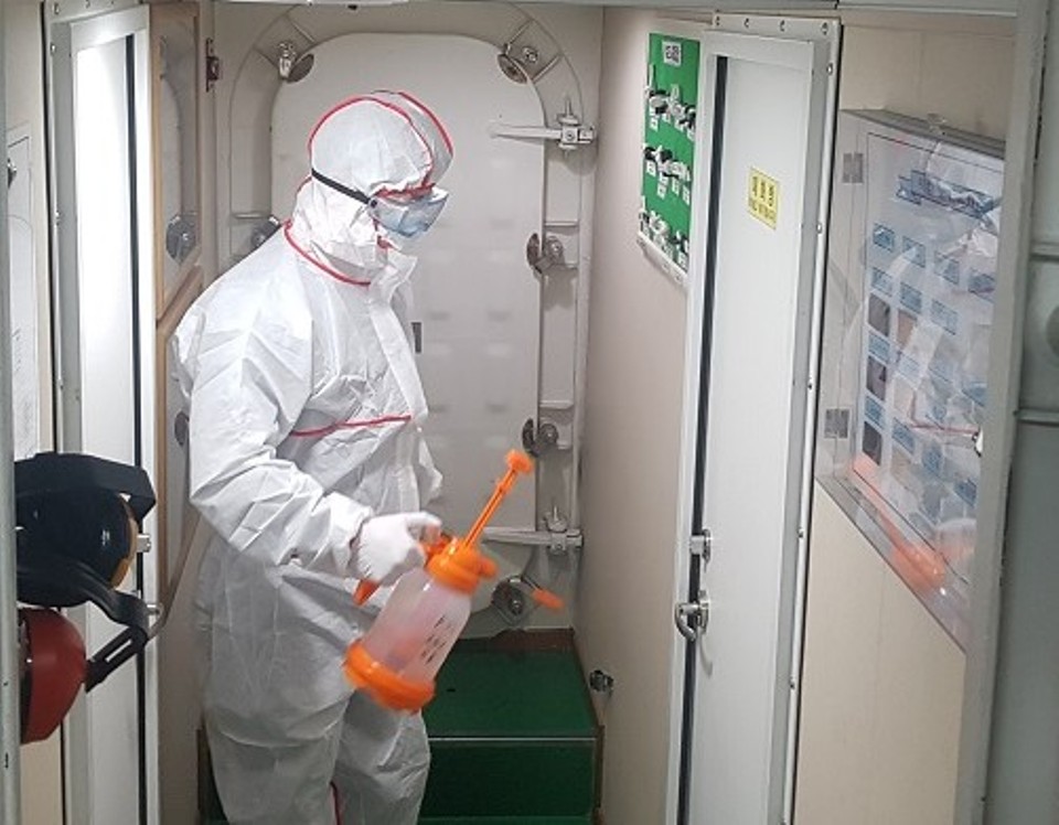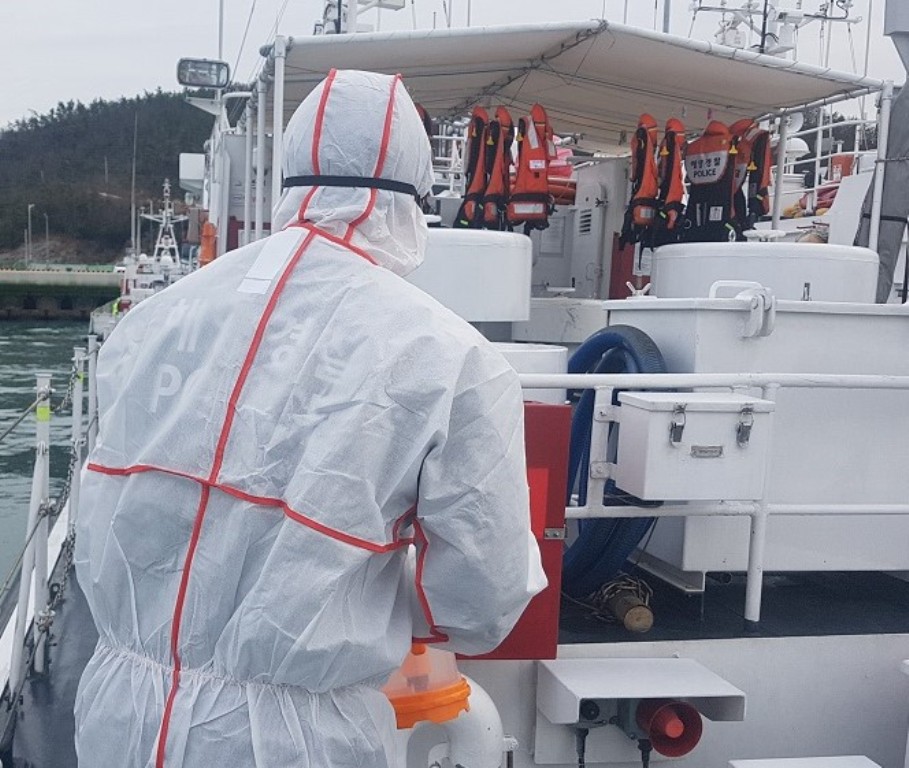 완도해경 경비함정은 출동 임무와 크기에 따라 짧게는 1박 2일에서 길게는 4박 5일 동안 함정 내에서 생활이 이뤄지는 만큼 감염병 확산에 취약할 수 있어,정박기간 내 실시하는 사설업체의 방역뿐만 아니라 출동 기간중에도 자체 실내 방역과 환기를 수시로 실시하고 발열 체크 등을 통해 승조원의 건강 상태를 확인하고 있다.