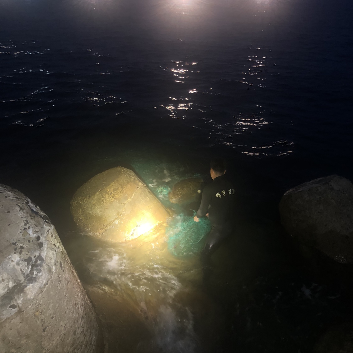 현장 확인 결과 붉은바다거북이 테트라포드 안쪽에 위치해 있어 연안구조정의 접근이 어렵자, 두 명의 해양경찰관이 직접 입수해 붉은바다거북의 몸을 감싸고 있는 폐그물을 칼로 잘라 완전히 제거했다.