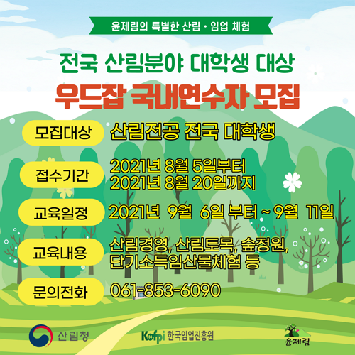 윤제림에서 전국 산림분야 대학생을 대상으로 특별한 산림님.임업 체험 "우드잡 국내연수자 모집" 한다고 밝혔다.
