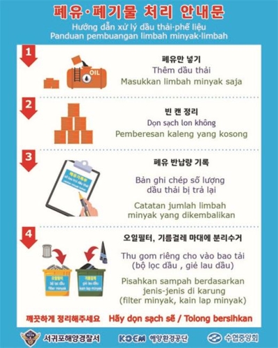 서귀포해양경찰서(서장 황준현)는 주요 항·포구 어선 폐유저장소에 폐유·폐기물(기름걸레·폐필터) 분리 배출방법...
