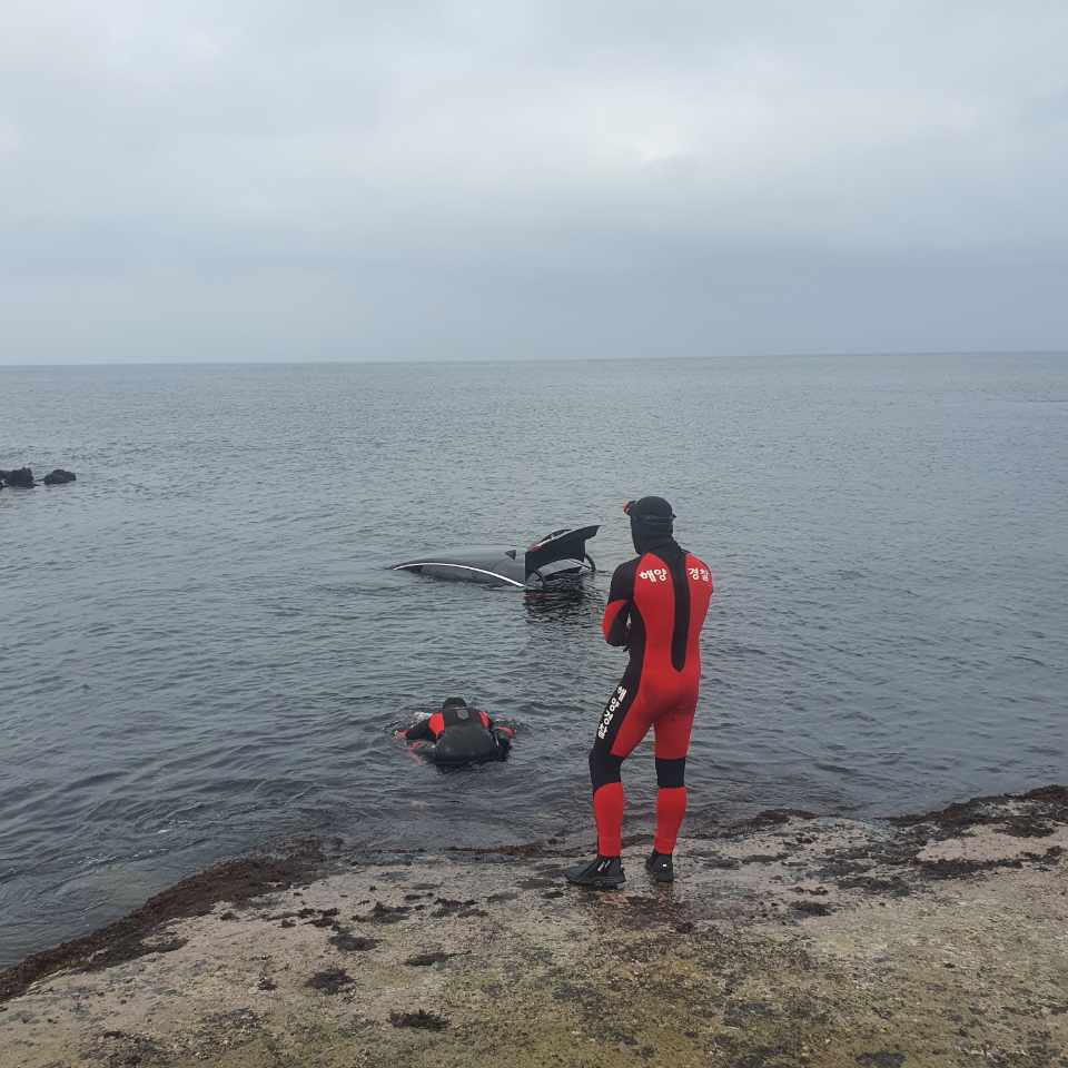 현장에 도착한 서귀포해경은 차량이 조류에 떠밀려 가는 것을 방지하고자 경찰관 두 명이 입수해 차량을 갯바위에 고정하는 작업을 실시했고, 오후 6시 15분쯤 포크레인을 이용해 육상으로 인양 완료했다.