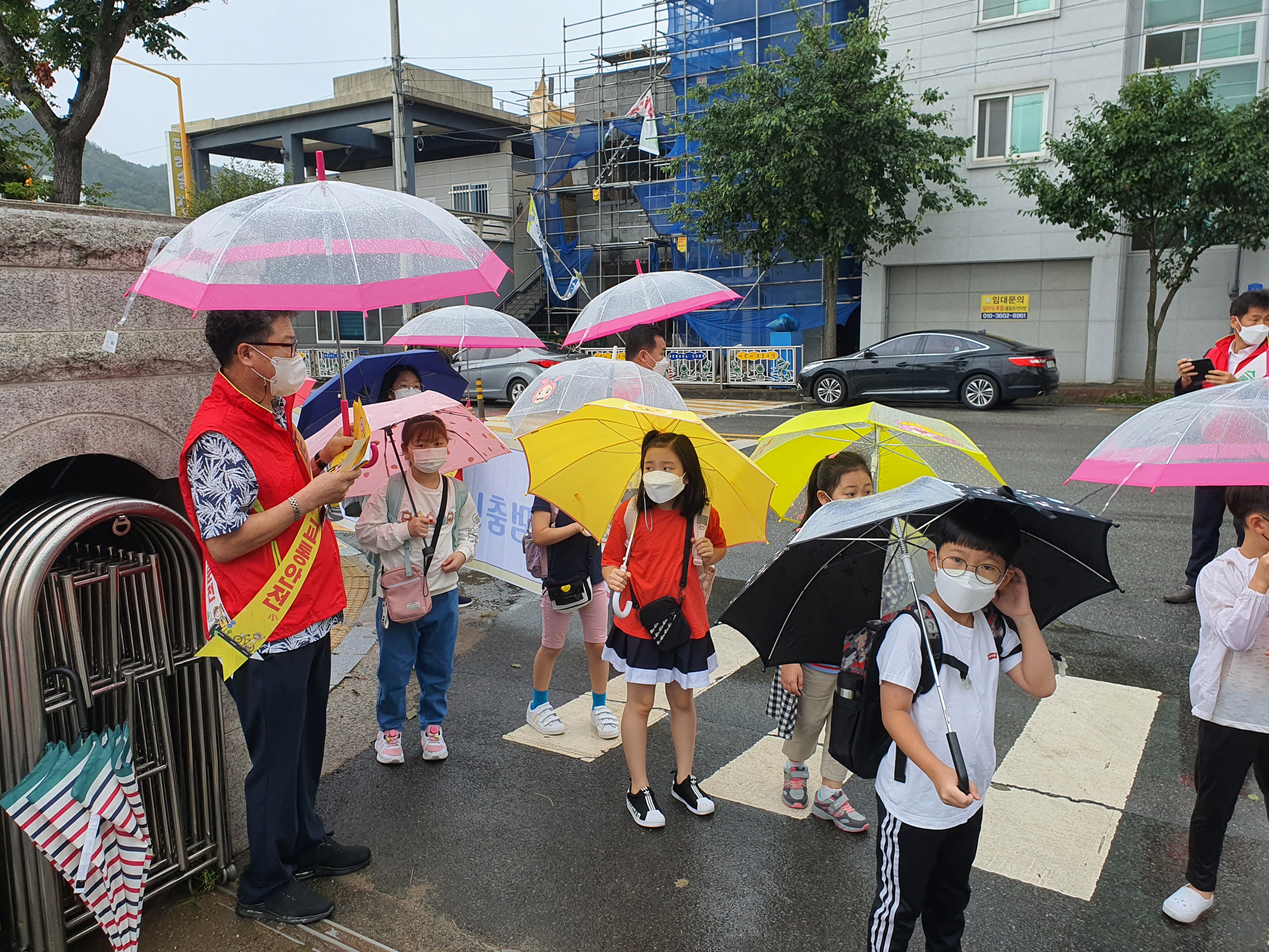 우중에서 힘겹게 어린이들에게 교통 캠페인과 투명우산 나눔 캠페인 행사를 지나가는 시민이 지켜보다가 저렇게 어린 학생들에게 관심을 보이는 사람들이 있어 참 보기 좋고 내 손주에게 관심을 둬 주는 것 같아 행복하다며 손들어주며 지나가는 모습이 모였다,