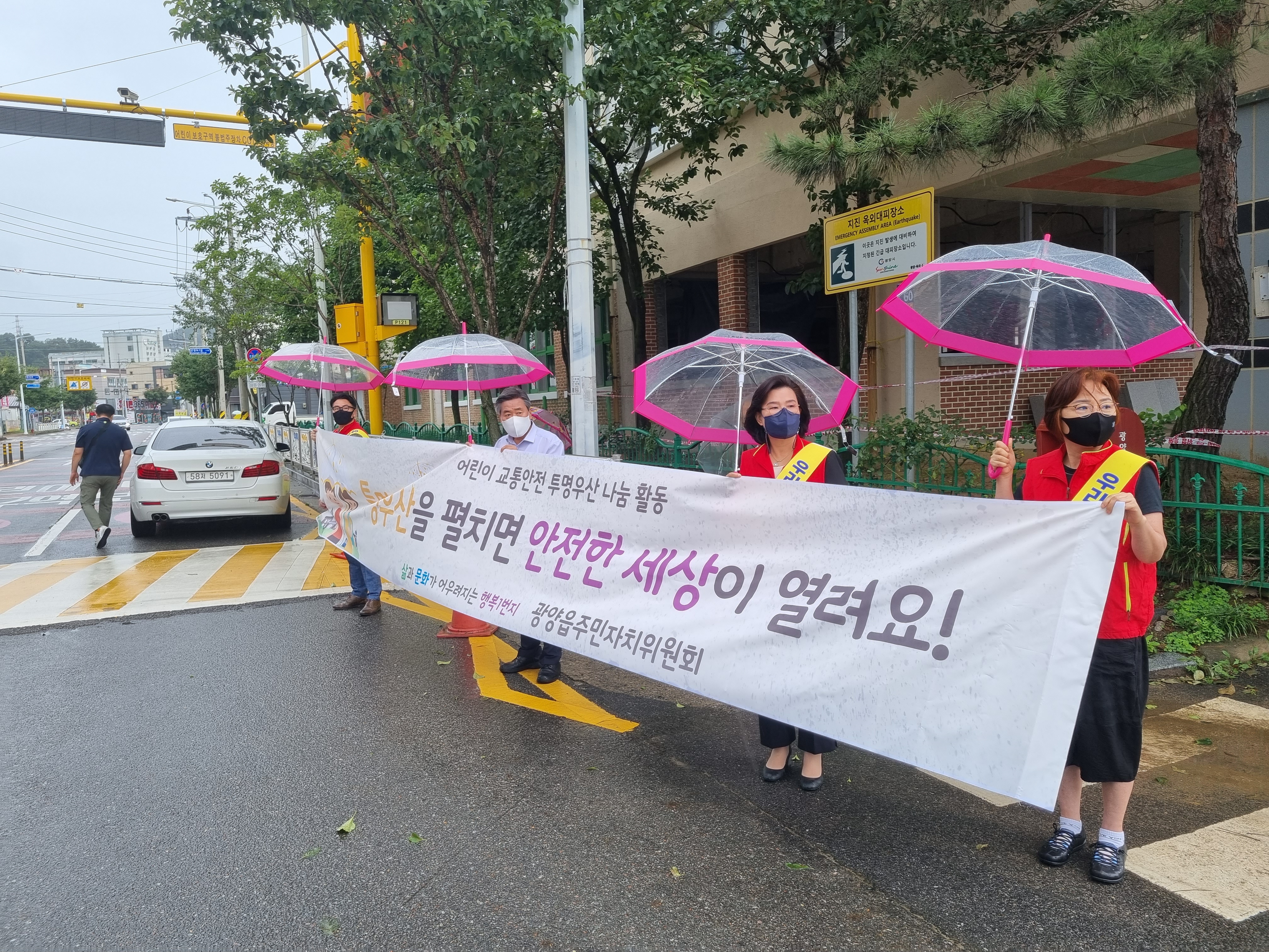 [해륙뉴스1] 유경열 기자=광양읍 주민자치위원회 “어린이가 왕이다.”. “우리가 보호하자”, “어린이 교통안전 투명우산 나눔 캠페인”으로 실천하였다. -
