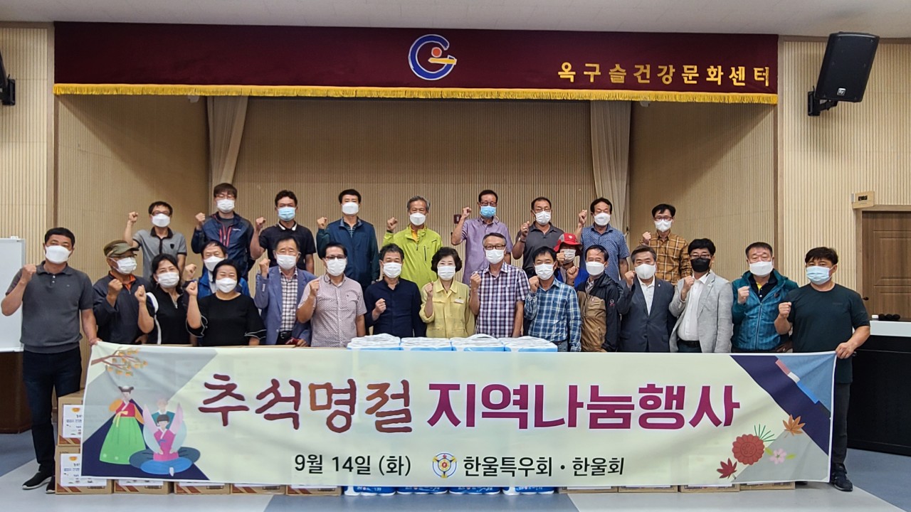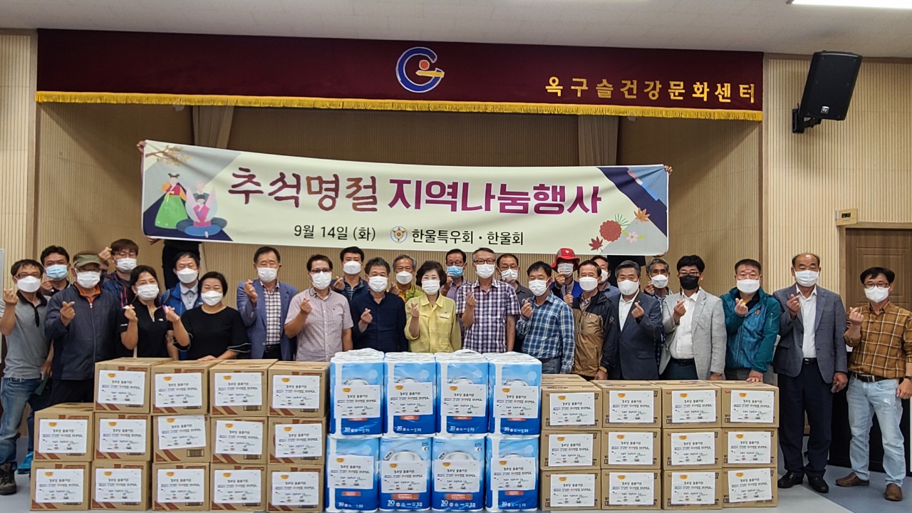 금일 행사는 한울 특우회 회장 정현국과 한울회 회장 류규열이 서정옥 옥곡면장과 박상주 옥곡면 이장 단장께 나눔 행사 물품(10만 원×20 합 200만 원)을 마을 경로(모)정과 옥곡면 대표경로정(합계 20곳)에 전달하기로 하였다.