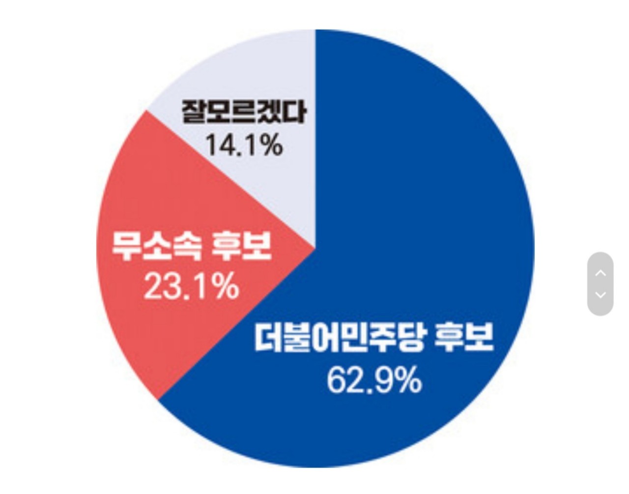 내년 광양시장 선거 역시 무소속의 맞대결이 점쳐지고 있는 가운데 민주당 후보와 무소속 후보 지지 의사를 묻는 질문에는 민주당 후보를 지지하겠다는 응답이 62.9%로 나타났고 무소속 후보를 지지하겠다는 응답도 23.1%를 차지했다. 모르겠다는 응답은 14.1%였다