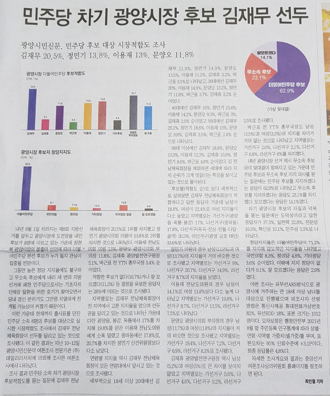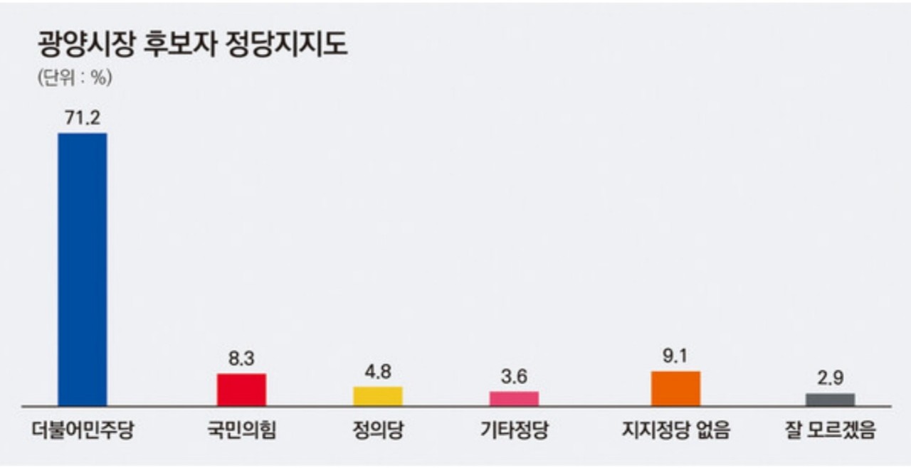 적합한 후보가 없다(16.7%)거나 잘 모르겠다(11.3%) 등 결정을 유보한 응답자는 28%에 이르는 것으로 조사됐다.'라고 한다. 지역별로는 김재무 전남체육회장이 전 지역에서 고른 지지율을 얻으며 선두권을 달리고 있는 것으로 나타난 가운데 다만 광양읍, 봉강, 옥룡에서 17%를 차지해 19.8%를 얻은 이용재 전남도의원에게 소폭 밀렸고 중마동에선 17.8%로, 20.7%를 차지한 정민기 산업건설위원장보다 다소 낮았다.