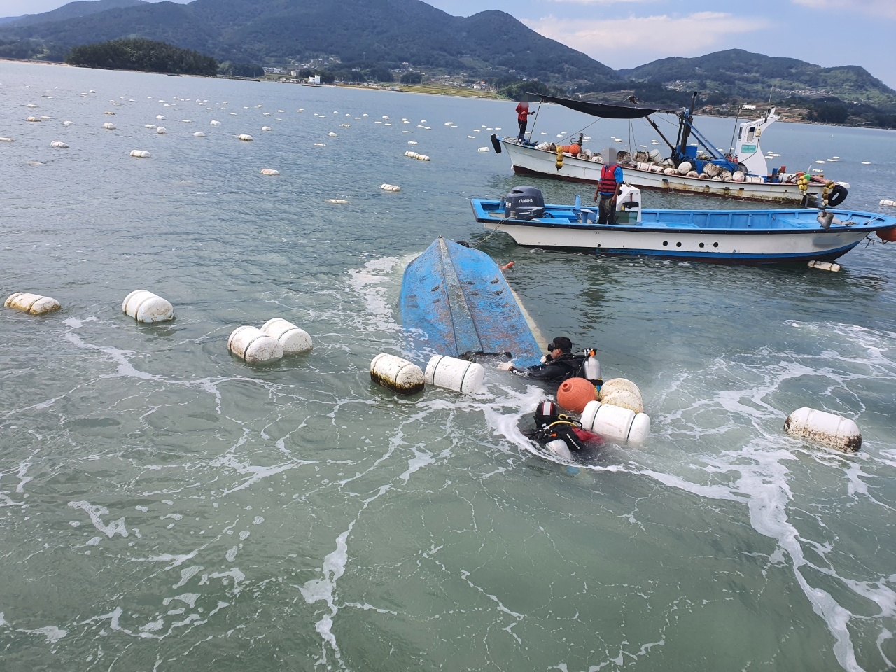 A호(0.56톤, 연안복합, 남해군 선적, 승선원 2명)가 조업 중 돌풍과 추진기 로프류 감김 사고의 영향으로 전복되자 인근 선박에서 통영해경 상황실로 신고한 것이다.