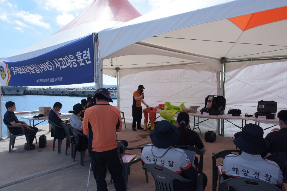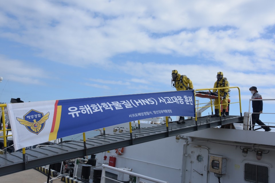 이번 훈련은 서귀포해경서를 비롯하여 제주해경청, 영산강유역환경청 등 관계기관이 참여해 코로나19 방역지침에 따라 진행되었으며, ▴참가자 안전교육, ▴인명구조, ▴안전구역설치, ▴파공부위 봉쇄, ▴제독 등 단계별 현장 대응 훈련을 실전처럼 실시했다.