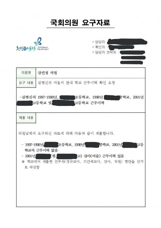 7일 안민석 더불어민주당 의원은 “서울교육청으로부터 제출받은 자료를 확인한 결과 김씨는 지난 1997년부터 2년 동안 서울 대도초와 1998년 서울 광남중, 2001년 서울 영락고의 근무 이력이 없었다”고 밝혔다.