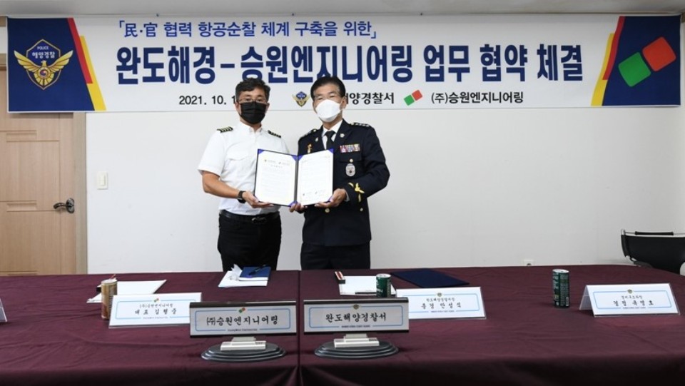 완도해양경찰서(서장 안성식)는 15일 승원엔지니어링(대표 김형중)과 해상치안, 수색구조 및 해양환경 감시활동 협력체계를 구축하여 안전하고 깨끗한 바다를 실현하기 위해 업무협약(MOU)를 체결했다고 18일 밝혔다.
