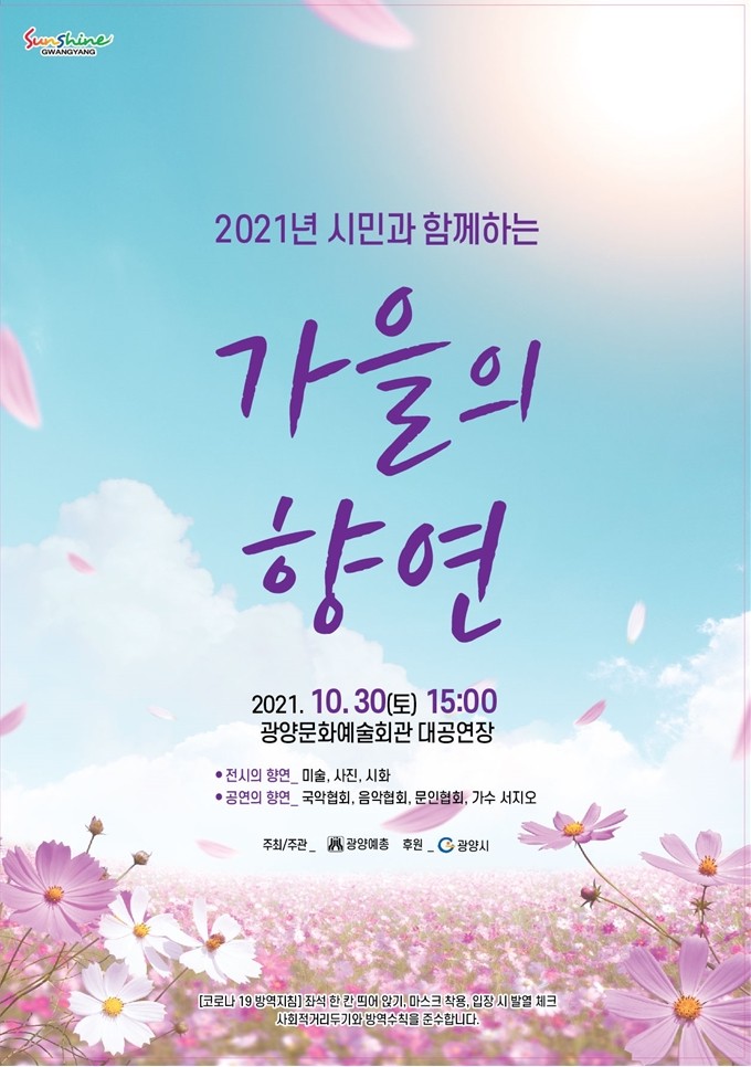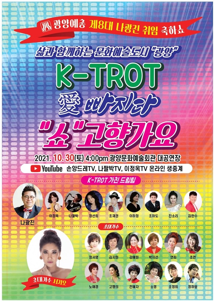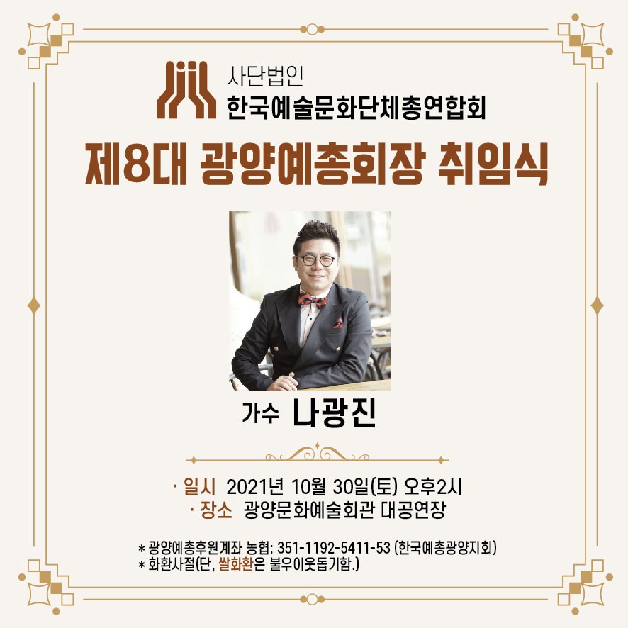 광양예총은 ”최한아름의 진행”으로 제7대 이임순 회장을 초청하여 제8대 나 회장의 이·취임식과 더불어 오후 3시부터는 2021 시민과 함께하는 ”가을의 향연“. 오후 4시에는 ”나광진 취임 축화 쇼 ”쇼“고향가요”를 평소 나광진 회장과 친분이 있는 연예인 “이정옥.나팔박.정선희.조재권.이하정.조하도.진소리.김한수”의 축하 무대에 이어 초대가수 “서지오.정서영.김지원.강혜원.박지선.노애경.고맹의.전혜자.소영.조정희”등과 나광진과함께 광양을 대표하는 가수 “연희.초연.정하윤” 등이 출연할 예정이다.